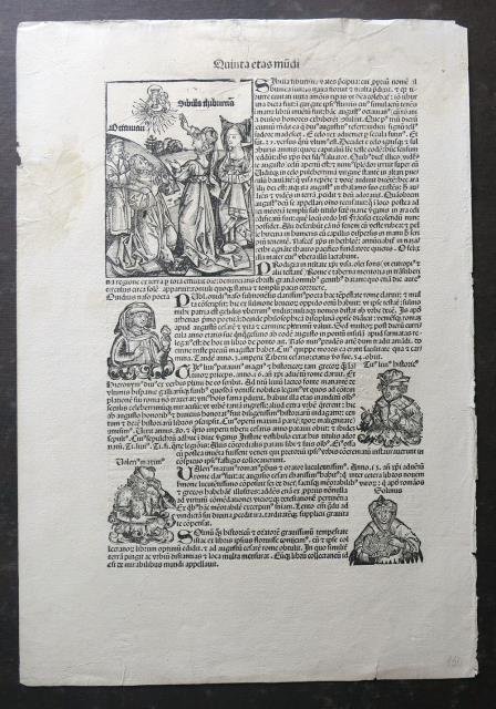 Anton Koberger, Norimberga, 1493. Dal “Liber Chronicarum Nurembergensi”, xilografia stampata su carta forte, b/n, cm 32 x 47,5 (il foglio), testo latino e immagini al recto e al verso (Sibilla che si rivolge alla Vergine in cielo; al verso figure di imperatori, tra cui Ottaviano Augusto e Marco Antonio). Un aloncino al margine laterale sinistro e lievi difetti al margine superiore, altrimenti pagina ben conservata.
