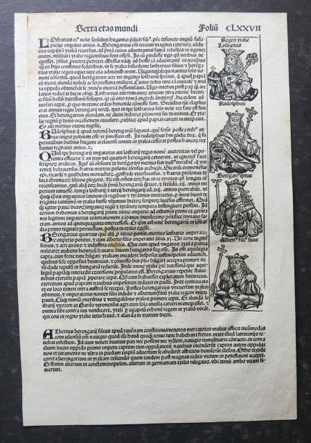 Anton Koberger, Norimberga, 1493. Dal “Liber Chronicarum Nurembergensi”, xilografia stampata su carta forte, b/n, cm 28 x 42 (il foglio), testo latino e immagini al recto e al verso (figure di re e imperatori tra cui Lotario al recto e Lario al verso). Pagina ben conservata.