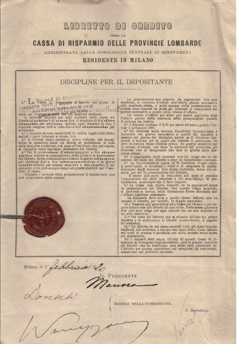 Libretto di credito verso la cassa di risparmio in Chiavenna