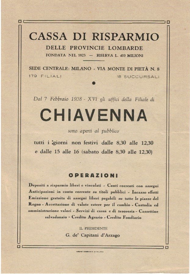 All'interno si trova un volantino, staccato dal libretto, datato 7 febbraio 1938 - XVI sugli orari di apertura della filiale.