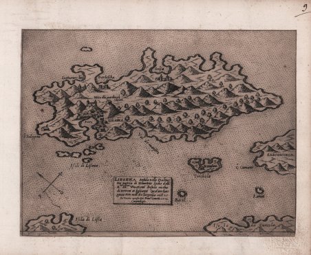 In basso al centro, in un riquadro, si legge: LIESENA Insula della Dalmatia patria di Demetrio locho delli S.ri Ill.mi Venetiani Insula ricca di terreni et bestiami Qual per longezza tien mill: 60. largezza mill. 25. In Venetia apresso Gio. Franc.o Camotio 1571. Cum privilegio. Orientazione fornita da una rosa dei venti, con il nord-est in alto. Priva di scala grafica. Carta dell’isola di Hvar (it. Lesina), nella Croazia meridionale. Le fonti della carta sono da ricercare nei modelli gastaldini e nella mappa della Dalmazia del Camocio stesso. Appartiene al corpus di opere dell’editore asolano che confluisce nelle varie edizioni della raccolta Isole Famose. Camocio, nato nella prima metà del secolo XVI probabilmente ad Asolo, si trasferì poi a Venezia, dove la sua attività editoriale e registrata dal 1552, anno in cui ottenne dal Doge un privilegio di quindici anni per la pubblicazione di due volumi di alcuni scritti di autori greci in traduzione latina. Era proprietario della libreria Al segno della Piramide a San Lio in Merceria, dove la sua attività principale era la vendita di stampe e incisioni, riproduzioni calcografiche di opere d’arte e carte geografiche. Il disegno di una piramide su quattro sfere, poggiata su un piedistallo con il motto Prudentia perpetuat e la testa di un serpenterappresentano la sua marca tipografica. Si suppone che l’editore sia morto intorno al 1575, perché dopo questa data, che corrisponde poi all’anno di diffusione di una grave pestilenza a Venezia, non si hanno più notizie della sua attività. Furono molte le carte di piccolo formato, pubblicate sciolte tra il 1566 e il 1574, che confluirono nella raccolta Isole famose, porti, fortezze e terre maritime. L’opera di Camocio nasce come una raccolta di carte sciolte, principalmente relative al 1570-71 circa, molte delle quali descrivono i territori veneziani nei Balcani e in Grecia. La produzione di piccole mappe nel biennio crebbe a dismisura; le opere furono prodotte in gran parte per documentare le scorribande turche nel Mediterraneo, con i tentativi di attacco, gli assedi, le battaglie che coinvolsero le fortezze veneziane sulle coste balcaniche e le principali isole della Grecia durante la cosiddetta Guerra di Cipro (1570-73, cfr. Brummet, Mapping the Ottomans, 2015). Le prime stesure della raccolta camociana sono prive del numero ordinale, e si trovano spesso legate in volumi di piccolo formato, privi del frontespizio. Non e assolutamente raro trovare le piccole incisioni anche in raccolte fattizie cinquecentesche di grande formato, spesso stampate due per foglio. Esemplare nel primo stato di due, avanti la numerazione, impresso su carta vergata coeva, rifilato al rame ed applicato su supporto coevo, in ottimo stato di conservazione. ' Bibliografia Bifolco-Ronca (2018), Cartografia e topografia italiana del XVI secolo, p. 1346, tav. 602 I/II; Gallo (1950): p. 97, n. 15; Novak (2005): p. 305, fig. 12; Tolias (2011): n. 0364. In the lower center, in a box, we read: LIESENA Insula della Dalmatia patria di Demetrio locho delli S.ri Ill.mi Venetiani Insula ricca di terreni et bestiami Qual per longezza tien mill: 60. largezza mill. 25. In Venetia apresso Gio. Franc.o Camotio 1571. Cum privilegio. Orientation provided by a wind rose, with northeast at the top. Without graphic scale. Map of the island of Hvar, in southern Croatia. The sources of the map are to be found in the Gastaldic models and in Camocio's own map of Dalmatia. It belongs to the corpus of works of the Asolo publisher that flows into the various editions of the collection Isole famose, porti, fortezze e terre maritime. Camocio, born in the first half of the sixteenth century probably in Asolo, then moved to Venice, where his publishing activity and recorded since 1552, the year in which he obtained from the Doge a privilege of fifteen years for the publication of two volumes of some writings of Greek authors in Latin translation. He was the owner of the bookshop Al segno della Piramide in San Lio in Merceria, where his main activity was the sale of prints and engravings, intaglio reproductions of works of art and maps. The design of a pyramid on four spheres, resting on a pedestal with the motto Prudentia perpetuat and the head of a serpenterappresent his typographical mark. It is assumed that the publisher died around 1575, because after this date, which corresponds to the year of the spread of a serious plague in Venice, there is no more news of his activity. There were many papers of small format, published loose between 1566 and 1574, which came together in the collection Isole famose, porti, fortezze e terre maritime. Camocio's work began as a collection of loose charts, mainly relating to about 1570-71, many of which described Venetian territories in the Balkans and Greece. The production of small maps in the two-year period grew by leaps and bounds; the works were produced largely to document Turkish incursions into the Mediterranean, with attempted attacks, sieges, and battles involving Venetian fortresses on the Balkan coast and the main islands of Greece during the so-called War of Cyprus (1570-73, see Brummet, Mapping the Ottomans, 2015). The earliest issues of the Camocian collection lack the ordinal number, and are often found bound in small-format volumes, lacking the title page. It is not at all uncommon to find the small engravings also in sixteenth-century factitious collections of large format, often printed two per sheet. Exemple in the first state of two, before the number, printed on contemporary laid paper, trimmed to the copperplate and applied to contemporary support, in excellent condition. ' Bibliografia Bifolco-Ronca (2018), Cartografia e topografia italiana del XVI secolo, p. 1346, tav. 602 I/II; Gallo (1950): p. 97, n. 15; Novak (2005): p. 305, fig. 12; Tolias (2011): n. 0364. Cfr.