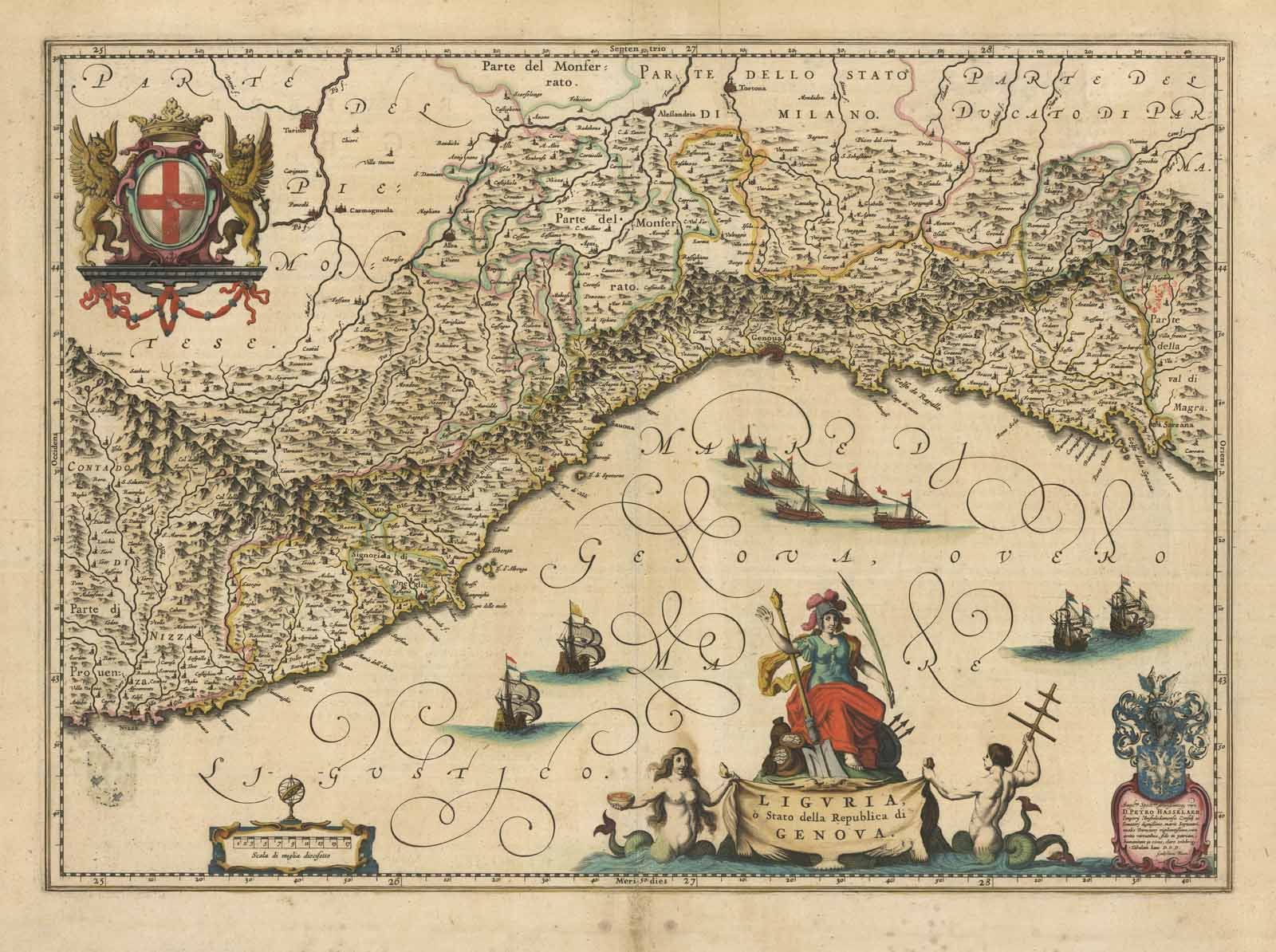 Carta geografica raffigurante i territorio della Liguria racchiusa da margine graduato. Per quanto concerne l'orientamentoil nord è posto nel margine superiore. Vari elementi rendono la carta assai piacevole e decorativa. Nell'angolo in alto a sinistra lo scudo della città di Genova, alcuni vascelli raffigurati sul mare Ligure, un riquadro a volute in cui è riportata la scala grafica in "Miglia diecisette", un animato cartiglio in cui è riportato il titolo e per finire nell'angolo in basso a destra cartiglio con dedica a D. Petro Hasselaer. La carta è caratterizzata da una bella e vivace coloritura coeva all'acquerello che evidenzia i confini con i territori confinanti: Val di Magra, Ducato di Parma, Stato di Milano, Monferrato, Piemonte e Nizza. Antico restauro alla piega centrale ed alcune piccole macchie nel margine inferiore che non compromettono l'ottima godibilità dell'incisione.