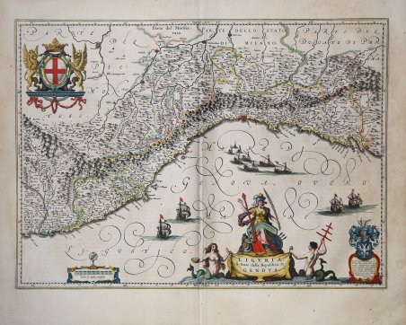 Carta geografica inserita nell'Atlas Major ' del Blaeu.Dal punto di vista cartografico la mappa deriva dalla carta del Magini già ripresa in Olanda da Jodocus Hondius. Willem Janszoon Blaeu, avviò nel 1599 la sua attività di costruttore di globi e strumenti astronomici ad Amsterdam. Nel 1630, dopo aver comprato alcune lastre dell’atlante del Mercator da Jodocus Hondius II, fu in grado di pubblicare un volume di 60 mappe con il titolo di ' Atlantis Appendix. Cinque anni dopo, pubblicò i primi due volumi del suo atlante ' Atlas Novus ' o ' Theatrum Orbis Terrarum, ' in sei libri. Dopo la sua morte, Joan (Johannes) continuò l’opera paterna, completando l’intera serie di sei volume dell’Atlas Novus ' intorno al 1655. Fu inoltre autore di un ' Atlas Maior sive Cosmographia Blaviana, in 12 volumi pubblicati nel 1662 -72, dei quali uno dedicato all'Italia. La carta compare per la prima volta nel terzo volume del ' Theatrum. ' Secondo Koeman viene pubblicata in primis nell'edizione francese del 1640, dal titolo ' Le Theatre du Monde ou Nouvel Atlas, ' Mis en lumiere par Guillaume & Jean Blaeu. ' Troisieme partie. A Amsterdam, Chez Iean & Corneille Blaeu MDCXL. Il terzo volume del ' Theatrum ' contiene 58 carte dell'Italia e 4 della Grecia (cfr. Koeman, ' Atlas Neerlandici, pp. 160-162, Bl 35A). Le carte dell'italia derivano tutte dall'opera di Giovanni Antonio Magini. Tuttavia, sembra più probabile che il Blaeu si basi sue quelle di Hendrick Hondius e Johannes Janssonius pubblicate nel ' Theatrum Italiae in quo Eius Regna, Domina, Ducatus, Et Speciatim Illorum Provinciae, Tabulis Accuratissimis, Iam, De Novo in Lucem Editio, Describunter, Quorum Sequens Pagina Indicabit, stampato ad Amsterdam da Hendrick Hondius nel 1636. ' Sebbene pubblicate dopo la morte di Willem Janszoon Blaeu (1638) le carte spesso recano il suo imprint. Non è dato sapere se fossero tutte già pronte o se i figli Johannes e Cornelis le compilarono postume. Incisione in rame, magnifica coloritura coeva, in ottimo stato di conservazione. Striking example of Blaeu's decorative map of Liguria after Giovanni Antonio Magini. Willem Janszoon Blaeu, started in 1599 his business as a builder of globes and astronomical instruments in Amsterdam. In 1630, after buying some plates of the Mercator atlas from Jodocus Hondius II, he was able to publish a volume of 60 maps under the title ' Atlantis Appendix. Five years later, he published the first two volumes of his atlas ' Atlas Novus ' or ' Theatrum Orbis Terrarum, in six books. After his death, Joan (Johannes) continued his father's work, completing the entire six-volume ' Atlas Novus ' series around 1655. He was also the author of an ' Atlas Maior sive Cosmographia Blaviana, in 12 volumes published in 1662 -72, one of which was devoted to Italy. The map first appears in the third volume of the ' Theatrum. According to Koeman it is first published in the French edition of 1640, entitled ' Le Theatre du Monde ou Nouvel Atlas, Mis en lumiere par Guillaume & Jean Blaeu. Troisieme partie. In Amsterdam, Chez Iean & Corneille Blaeu MDCXL. The third volume of the ' Theatrum ' contains 58 maps of Italy and 4 of Greece (see Koeman, ' Atlas Neerlandici, pp. 160-162, Bl 35A). The maps of Italy are all derived from the work of Giovanni Antonio Magini. However, it seems more likely that Blaeu relies on those of Hendrick Hondius and Johannes Janssonius published in ' Theatrum Italiae in quo Eius Regna, Domina, Ducatus, Et Speciatim Illorum Provinciae, Tabulis Accuratissimis, Iam, De Novo in Lucem Editio, Describunter, Quorum Sequens Pagina Indicabit, ' printed in Amsterdam by Hendrick Hondius in 1636. Although published after the death of Willem Janszoon Blaeu (1638) the maps often bear his imprint. It is not known whether they were all ready-made or if his sons Johannes and Cornelis completed them posthumously. Copperplate, with fine original colouring, in very good conditions. Cfr.
