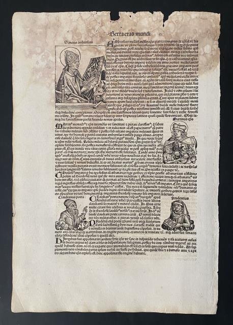 Dal “Liber Chronicarum Nurembergensi”, Norimberga, 1493. Foglio CXXXIIII. Xilografie stampate su pagina singola, b/n, cm 32,5, x 47,5 circa (il foglio). Al recto del foglio quattro immaginette con la linea degli imperatori; al verso Sanctus Ambrosius più altre tre immaginette. Foglio interessato da diffusa presenza rosso - violacea, il cosiddetto fungo rosso, ma al solo margine superiore, peraltro ben impresso e in buono stato di conservazione. .