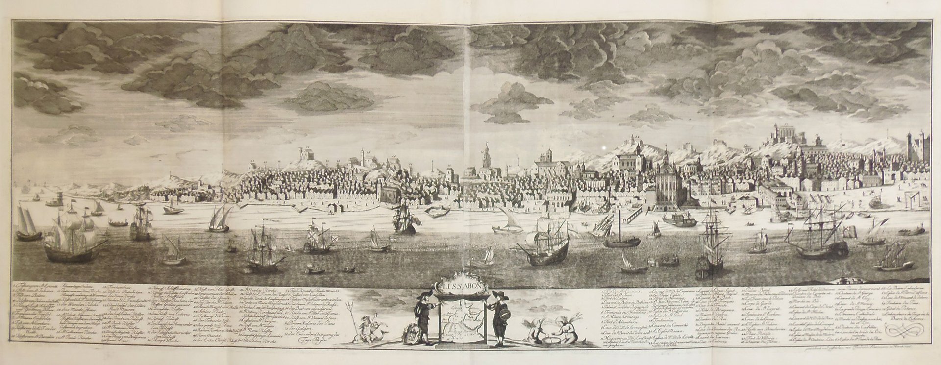 Copper plate, large finely engraved double-sheet panoramic view, joined at the center, 417 x 1174 mm (plate), detailed index in French and German below view, title cartouche featuring an inset map of Portugal, flanked by two explorers, cherubim examining a compass, and Poseidon with his trident. <BR>Published a year after the Great Earthquake that destroyed many of the buildings depicted herein. OCLC locates only two copies: one at Harvard, and the other in the Bibliotheque Nationale in France.<BR>Perfect condition. Very good. <BR>