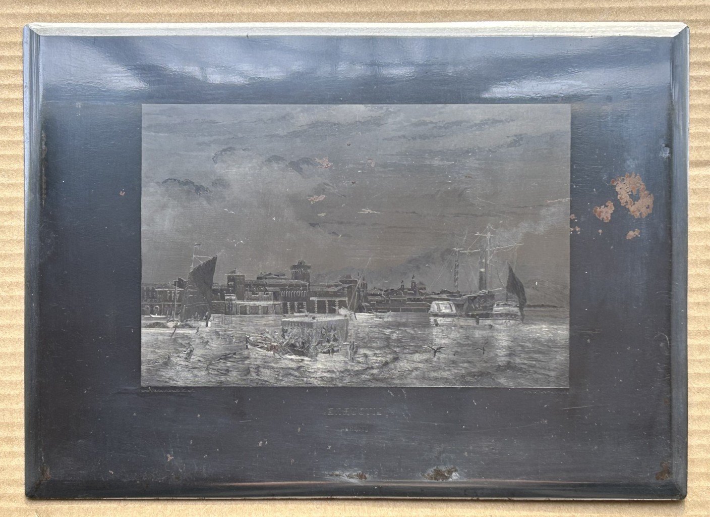 Matrice originale incisa all’acquaforte databile alla metà del XIX secolo. Affascinante poter vedere il lavoro inciso direttamente sulla lastra e poterne valutare i differenti tratteggi. La lastra si presenta in ottime condizioni, salvo piccoli restauri, ed ancora utilizzabile per ulteriori stampe calcografiche. Usata per la tiratura della stampa inserita nell'edizione "Voyage Pittoresque en Italie, partie septentionale" par M. Paul. de Musset, Paris 1855. Autore: Rouargue frères del et sculp. Luogo: Livorno. Anno: 1855. Tecnica: acquaforte su lastra di metallo acciaiata. Dimensioni: 122x182 (lastra mm 205x285).