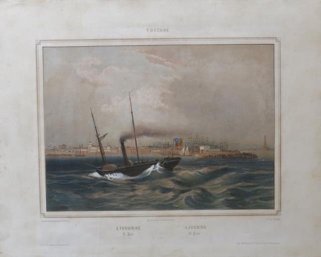 Parigi, 1850 circa. Litografia in colore d'epoca, cm 21,5 x 29 (la parte figurata delimitata da filetto) più margini. Piacevole ed elegante veduta della cittadina ripresa dal mare e in lontananza ma con tutti i sui edifici più riconoscibili, tra cui la fortezza Vecchia, la Fortezza Nuova e il faro sulla destra; in primo piano si profila un'imbarcazione a vapore.