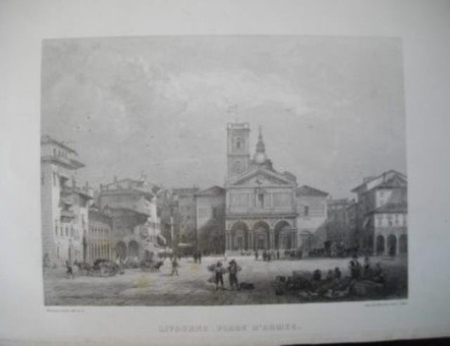 Parigi, 1860 circa. Incisione su acciaio, b/n , cm 12 x 16 circa (la parte incisa più margini). Delineata e incisa dai fratelli Rouarge. Vivace raffigurazione molto animata dell'allora Piazza D'Arme, divenuta Piazza Grande dopo la ricostruzione a seguito della distruzione dei bombardamenti della seconda guerra, in cui furono distrutti i suoi più bei edifici, tra cui il Duomo e il Palazzo Granducale. Tenue impressione, buono stato. .