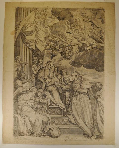 Incisione all'acquaforte e bulino di mm 355 x 505 su carta di filo. Filigrana cerchio. Secondo stato su due. In basso a sinistra "Paulli Caliarij Veronensis opus in ecclesia D. Caterinae Venetijs", alla stessa altezza più a destra "Giacomo Franco Forma" ed ancora più a destra "Aug. Car. fe. 1582". Impressione piuttosto tarda di questo secondo stato stampato da Giacomo Franco a Venezia; rilevabile infatti in alto a destra una frattura della lastra. Da un dipinto di Paolo Veronese oggi alle Gallerie dell'Accademia di Venezia, ma attorno al 1575 nella Chiesa di Santa Caterina. Riferisce Diane Degrazia nel volume "Le stampe dei Carracci" 1984: " Nessuno ha messo in dubbio questa stampa firmata e datata. Il Bartsch affermò giustamente che si trattava di un'opera fra le più felici di Agostino ma criticò l'uniformità dei segni impiegati. L'artista variò poco la coposizione originale e rese molto bene gli effetti scintillanti dei materiali sontuosi che sono tipici del Veronese. Nell'Isabella Stewart Gardner Museum di Boston si trova un disegno che probabilmente è una copia di un seguace del Caliari da un disegno preparatorio dello stesso Veronese per il dipinto. Sebbene l'incisione di Agostino sia più vicina al quadro che questo foglio, il Carracci potrebbe avere avuto contatto con uno degli studi di Caliari per l'opera, e forse lavorò su un disegno perduto della composizione". Degrazia 104. Boschini p. 755. Malvasia p76. Bellori p.115. Oretti p. 795. Basan p. III. Strutt p.181. Joubert p. 348. Bolognini Amorini p.55. Nagler 1835, p.393. Mariette II, 54. Le Blanc 77. Foratti p. 170. Ostrow 35.