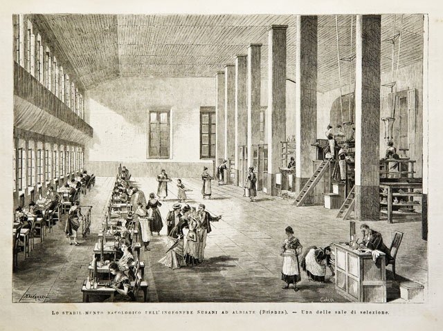 Lo stabilimento bacologico dell’ingegnere Susani ad Albiate (Brianza).- Una delle sale di selezione