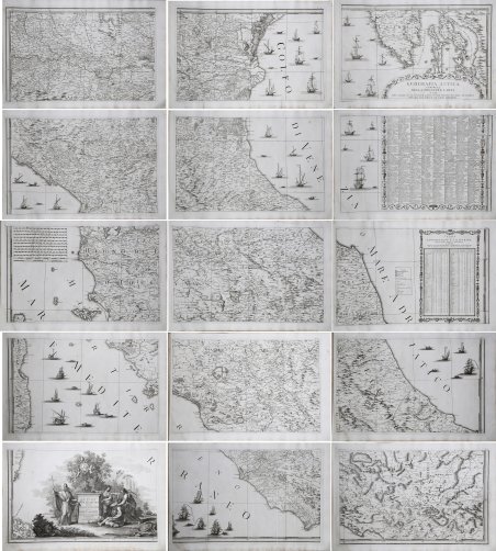 Lo Stato Ecclesiastico diviso nelle sue Provincie con le Regioni adiacenti delineato sulle ultime Osservazioni [entro il cartiglio figurato posto in basso a sinistra, sul fronte di un basamento di marmo circondato dalle allegorie di Chiesa, Scultura, Pittura, Disegno, con lo stemma di Pio VII tra gli alberi, sorretto da due putti, nonché, posto a terra sul lato destro, lo stemma di Mons. Alessandro Lante Montefeltro Della Rovere (1762-1818), Tesoriere Generale dello Stato Pontificio (poi elevato al rango di cardinale nel 1816) e, sul lato sinistro, la Lupa Capitolina]. Firma e dati editoriali in lastra: ". del P.D. Giovanni] M[aria) Cassini C[hierico] R[egolare] S[omasco]", e "ROMA presso la Calcografia C[amera]le/1805" [sotto al titolo, sul basamento al centro del cartiglio allegorico] Giovanni Maria Cassini (1745-1824 ca.), Chierico Regolare Somasco, geografo e cartografo, incisore (uno dei migliori discepoli di Giovanni Battista Piranesi), fu anche uno degli ultimi sferografi italiani del Settecento e i suoi globi ebbero una notevole diffusione. Calcografia Camerale, o anche Tipografia della Camera Apostolica, attiva a Roma dal 1738 al 1870, creata con l'acquisto delle lastre di rame della bottega della famiglia de Rossi (la "Stamperia alla Pace"), per ordine di Papa Clemente XII; diventa "Calcografia Regia" (o "Regia Calcografia") nel 1870, poi "Calcografia Nazionale" nel 1945 e, da ultimo, "Istituto Centrale per la Grafica" nel 1975, a seguito della sua fusione con il Gabinetto Nazionale delle Stampe Roma, 1805. Incisione su rame, in 15 fogli giuntati; dimensioni 1960 x 1870 mm (totale) [620 x 390 mm (singola incisione)]. Orientazione assente; margine graduato lungo tutta la cornice, numerato; con reticolo geografico dodici scale grafiche diverse [sul lato sinistro: al foglio n. 7]; longitudini riferite al meridiano dell'Isola del Ferro; tavola delle latitudini e delle longitudini [sul lato destro: al foglio n. 9]; grande tavola della toponomastica antica dei principali luoghi contenuti nella carta, con il titolo Geografia Antica" [in alto a destra: ai fogli n. 12 e n. 15]. Una seconda edizione di questa carta, con alcune modifiche, è stata pubblicata nel 1824 dalla stessa Calcografia Camerale. “Eccola, in tutta la sua superba e monumentale bellezza, l’Italia di Mezzo che il Cassini ci aveva annunciato già nel 1791, quando era alle prese con le carte del primo volume del Nuovo Atlante Geografico Universale, dove e contenuto l'esemplare che abbiamo scorso una ventina di pagine indietro. Le due incisioni portano un titolo assai simile e in entrambe si fa riferimento allo Stato Ecclesiastico diviso nelle sue provincie, seppure il confronto tra questa e quella lascia senza parole anche i profani di cartografia. Troppa è la differenza, non solo per l'aspetto estetico e dimensionale, ma soprattutto sorprende l'accuratezza geo-topografica, che rende possibile, proprio grazie alle dimensioni, la visione dei toponimi dei centri abitati più piccoli e dispersi. Qui li troviamo quasi tutti e per lo più nella dizione corretta, tanto che non finiremmo mai di inseguirli. Altrettanto piacevole è la raffigurazione oro-idrografica, con i rilievi montuosi disegnati in forma finemente prospettica e i corsi d'acqua con un tratto cura è rivolta alla rete stradale, dove trova spazio anche la viabilità meno transitata e battuta. Un tocco di perfezionismo è rappresentato dalla figurazione arboreo-boschiva, utile ausilio all'organizzazione di battute caccia, Sulla destra, sotto le isole dalmate, spiccano due tabelle riquadrate da delicati motivi vegetali di sapore raffaellesco. Quella più grande annota su otto colonne i nomi delle città, dei fiumi e dei laghi principali dell'antichità, che nella carta sono riportati con denominazione moderna, mentre quella sottostante più piccola, indica longitudini e latitudini, utilizzando come meridiano di riferimento quello dell'Isola di Ferro. Sul lato opposto, nella parte super. Lo Stato Ecclesiastico diviso nelle sue Provincie con le Regioni adiacenti delineato sulle ultime Osservazioni ' [entro il cartiglio figurato posto in basso a sinistra, sul fronte di un basamento di marmo circondato dalle allegorie di Chiesa, Scultura, Pittura, Disegno, con lo stemma di Pio VII tra gli alberi, sorretto da due putti, nonché, posto a terra sul lato destro, lo stemma di Mons. Alessandro Lante Montefeltro Della Rovere (1762-1818), Tesoriere Generale dello Stato Pontificio (poi elevato al rango di cardinale nel 1816) e, sul lato sinistro, la Lupa Capitolina]. Firma e dati editoriali in lastra: ' ". del P.D. Giovanni] M[aria) Cassini C[hierico] R[egolare] S[omasco]", ' e "ROMA ' presso la Calcografia C[amera]le/1805" [sotto al titolo, sul basamento al centro del cartiglio allegorico] Giovanni Maria Cassini (1745-1824 ca.), Chierico Regolare Somasco, geografo e cartografo, incisore (uno dei migliori discepoli di Giovanni Battista Piranesi), fu anche uno degli ultimi sferografi italiani del Settecento e i suoi globi ebbero una notevole diffusione. Calcografia Camerale, o anche Tipografia della Camera Apostolica, attiva a Roma dal 1738 al 1870, creata con l'acquisto delle lastre di rame della bottega della famiglia de Rossi (la "Stamperia alla Pace"), per ordine di Papa Clemente XII; diventa "Calcografia Regia" (o "Regia Calcografia") nel 1870, poi "Calcografia Nazionale" nel 1945 e, da ultimo, "Istituto Centrale per la Grafica" nel 1975, a seguito della sua fusione con il Gabinetto Nazionale delle Stampe Roma, 1805. Incisione su rame, in 15 fogli giuntati; dimensioni 1960 x 1870 mm (totale) [620 x 390 mm (singola incisione)]. Orientazione assente; margine graduato lungo tutta la cornice, numerato; con reticolo geografico dodici scale grafiche diverse [sul lato sinistro: al foglio n. 7]; longitudini riferite al meridiano dell'Isola del Ferro; tavola delle latitudini e delle longitudini [sul lato destro: al foglio n. 9]; grande tavola della toponomastica antica dei pri