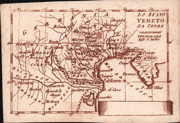RARITA’ CARTOGRAFICA Sconosciuta piccola carta geografica con imprint di Pietro Zancon e data 1794, appartenente a un non documentato atlante in miniatura dal titolo “Atlante tascabile per le dame”, suddiviso in tre tomi, stampati “IN VENETIA Presso G. Zatta”, senza data ma circa 1795. Si tratta di carte da visita – con un apposito spazio bianco dove apporre il proprio nome – dove compare l’imprint o di Pietro Zancon (accompagnato dalla data 1794) o di Giacomo Zatta (con data 1794 o 1795), che, come si legge sul frontespizio, risulta l’editore dell’opera. Possiamo ipotizzare che la serie, iniziata da Zancon fu poi terminata dallo Zatta. Sulla carta dell’Italia – presumibilmente la prima tavola dell’opera – compare stampato il nome di Chiara Minelli Rota, nobildonna veneziana che sposò Antonio Rota nel 1794; tutte le restanti 65 carte recano lo spazio bianco privo di nome. In precedenza, le carte erano note solo attraverso una serie, priva di imprint editoriale, venduta 21 anni fa (1999) dall’Antiquariaat Haas di Bedburg Hau; parlando con Stephan Haas, la serie, priva di titolo e dati editoriali si componeva di 70 mappe. Le carte furono vendute separatamente sotto il nome di G. Bonatti, firma dell’incisore che si trova nella carta della Francia. In seguito, le tavole furono attribuite a Pietro Zaricen da Geoffrey King (cfr. Miniature Antique Maps, p. 181). Il nome dello Zaricen viene dedotto dalla carta della contea del Roussillon, che reca l’iscrizione “Venezia 1794 App.o P. Zancon”, letto erroneamente come Zaricen. Lajos Szantai include la carta dell’Ungheria nella sua cartobibliografia, traducendo il nome dell’autore in Zancen (cfr. Atlas Hungaricus 1528-1850). Sempre King, che non menziona nessuna carta firmata da Zatta, sostiene che “About the turn of the century a signed card of the first edition, with a map of the province of Roussillon in the south of France, was seen at an Ephemera Society Fair in London”. Questo esemplare sembrerebbe oggi quello conservato alla Yale University Library [1978 351], che lo descrive composto da 70 carte geografiche. Non sappiamo se sia il numero totale delle mappe, e l’assenza di un indice o dell’elenco non consente di stabilire l’esatto numero delle carte che lo compongono. http://hdl.handle.net/10079/bibid/3611852Confrontando le carte erroneamente attribuite allo Zaricen ci si accorge che la lastra è abrasa in corrispondenza della firma di Zancon o Zatta. Molto scarse sono le notizie sulle carte che possiamo ora definire “ex Zaricen”. Jason Hubbard nella sua bibliografia recente sulle carte del Giappone raffigura la carta priva dell’imprint “App.o G. Zatta” attribuendola - sulla base delle informazioni bibliografiche finora note – a Giuseppe Bonatti e Pietro Zaricen: “This is one of the 70-odd geographical cards, printed on one side only, acquired by the Haas brothers in 1999. The cards cover countries around the world and include detailed map of Italian provinces. The card with the map of France carries the inscription: G. Bonatti fece; and it is presumed that Bonatti engraved all of them although this is questioned by King” (cfr. J. Hubbard, Japoniae Insulae, n. 124). Il nostro esemplare della carta della Francia, che reca l’imprint “Venezia 1794, App.o P. Zancon” reca in basso a destra la firma di Bonatti sopra menzionata. Dunque, l’unica differenza tra questa serie di sconosciute carte sembra essere la presenza degli imprint editoriali di Zancon e Zatta, accompagnati dalla data 1794 o 1795. Giuseppe Bonatti è menzionato da V. Valerio nella qualità di incisore cresciuto alla scuola Remondini di Bassano, autore di alcune carte per l’atlante di Pazzini Carli (Siena, 1788-1800) e per l’Atlante Geografico di Carlo Antonio Barbiellini (Milano, 1807). Dal 1809 in poi lavorò come incisore per il Deposito della Guerra di Milano (cfr. V. Valerio, Cartografi Veneti, p. 153). Pietro Zancon era, assieme . A GREAT RARITY Unknown small map with imprint by Pietro Zancon and date 1794, belonging to an undocumented miniature atlas entitled “Atlante tascabile per le dame” (Pocket Atlas for ladies), divided into three volumes, printed "IN VENETIA Presso G. Zatta", undated but about 1795. A rare set of visiting cards published in Italy features pretty little maps of all parts of the world - with a special white space where to put your name - where the imprint appears or of Pietro Zancon (accompanied by the date 1794) or Giacomo Zatta (with the date 1794 or 1795), who, as can be read on the title page, is the publisher of the whole Atlas. We can speculate that the series, started by Zancon was later terminated by Zatta. On the map of Italy is printed - presumably the first map of the work - the name of Chiara Minelli Rota, Venetian noblewoman who married Antonio Rota in 1794; all remaining 65 maps bear the blank space without names. Previously, the maps were known only through a series, without editorial imprint, sold 21 years ago (1999) by the Antiquariaat Haas of Bedburg Hau; speaking with Stephan Haas, the series, without title and printing details, consisted of 70 maps. The maps were sold separately under the name of G. Bonatti, the engraver's signature found on the map of France. Later, the plates were attributed to Pietro Zaricen by Geoffrey King (see Miniature Antique Maps, p. 181). The name of Zaricen is derived from the Roussillon county map, which bears the inscription "Venice 1794 App.o P. Zancon", incorrectly read as Zaricen. Lajos Szantai includes the map of Hungary in his cartobibliography, translating the author's name into Zancen (see Atlas Hungaricus 1528-1850). Always King, who does not mention any map signed by Zatta, said: "About the turn of the century a signed card of the first edition, with a map of the province of Roussillon in the south of France, was seen at an Ephemera Society Fair in London ". This copy would seem to be the one preserved in the Yale 