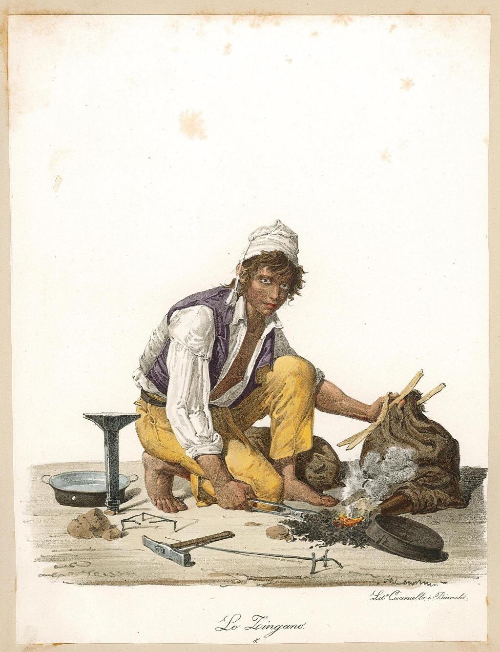Litografia, antica originale, in bella coloritura coeva, raffigurante uno zingaro nell'atto di aggiustare delle pentole. L'incisione è ridimensionata al margine ed applicata all'epoca su di un supporto cartaceo coevo