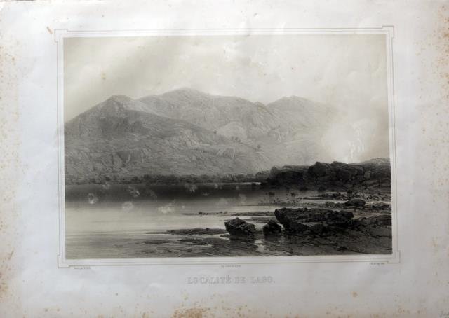 Lemercier, Parigi, 1851. Dall’opera “Album des diverses localitée formant les etablissements industriales d’acide boracique fondé en Toscane”, tonolitografia (nero /seppia), cm 28,5 x 41,2 ca. (la parte figurata), cm 42 x 59,2 ca. (il foglio). Disegnata da E. Chelli, litografata da Eugenio Ciceri e impressa da Lemercier, la veduta raffigura il paesaggio nei pressi della località di Lago prima dell’insediamento dell’industria boracifera. La presenza di acque bollenti e putride nella zona era nota fin dall’antichità. L’attività di sfruttamento dei vapori caldi, per ricavare acido borico, iniziò nel 1827, grazie all’ingegnere e imprenditore francese François Jaques de Larderel (Vienna, 5 agosto 1790 – Firenze, 15 giugno 1858), il quale promosse lo sfruttamento industriale dei soffioni boraciferi nella frazione del comune di Pomarance, attualmente nota come Larderello, appunto dal nome dello stesso Larderel. Le vedute si riferiscono quindi agli immediatamente precdenti l’impianto dei primi stabilimenti, il 1820 circa. Successivamente fu il principe Ginori a comprendere le potenzialità del luogo per produrre energia (ingabbiando il vapore sotto delle cupole si poteva ottenere energia elettrica) e a incentivarne lo sfruttamento. Leggero foxing ai margini bianchi. Peraltro bella la veduta in buono stato.