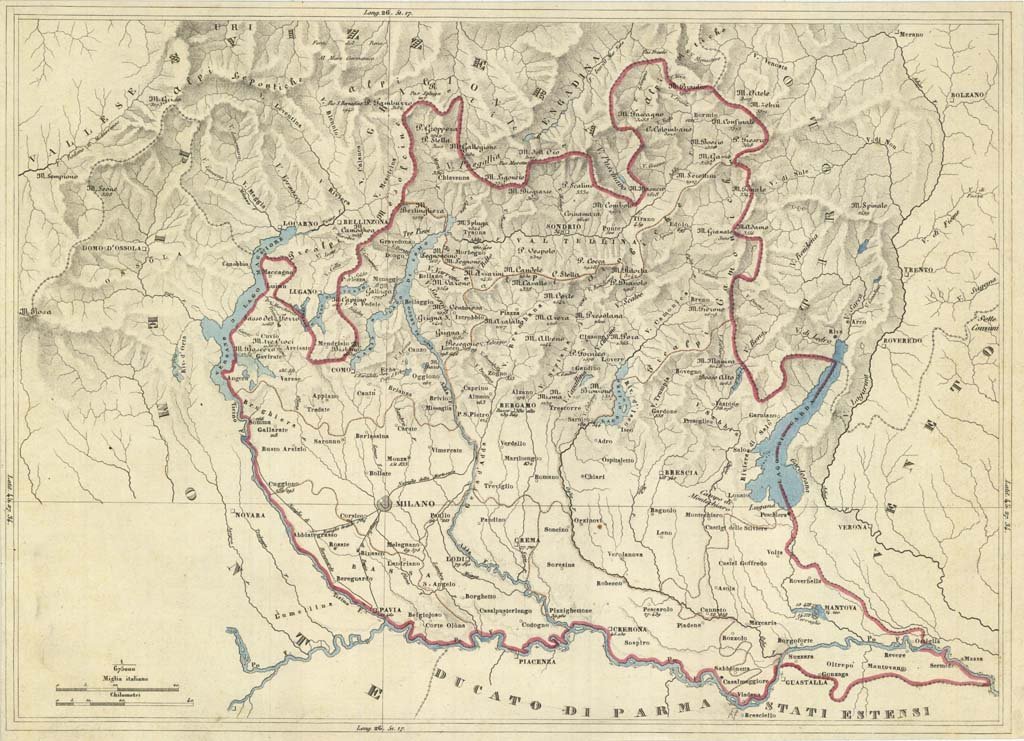 Carta geografica della Lombardia. Nell'angolo in basso a sinistra sono riportate le scale grafiche in "Miglia Italiane" e "Chilometri". Interessante notare l'indicazione nel filetto che inquadra la carta del dato della latitudine e quello della longitudine. L'incisione si presenta applicata su di un supporto cartaceo coevo.