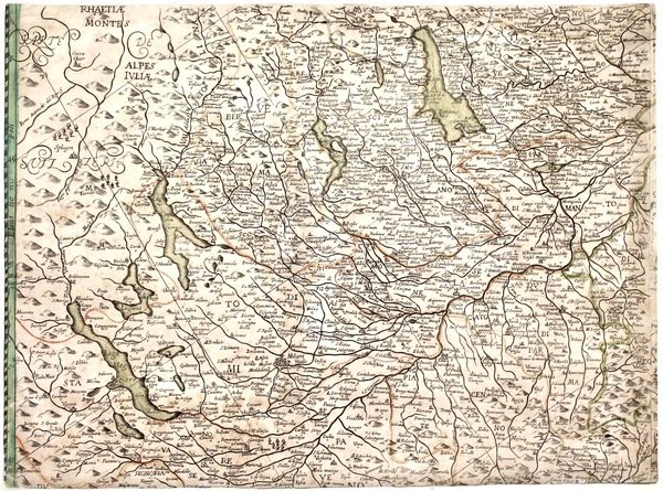 Incisione in rame, mm 380x520, dipinta a mano. Foglio centrale sinistro raffigurante tutta la Lombardia, il Veronese e il Ducato di Parma e Piacenza. Tratta da un'edizione non identificata della grande carta dell'Italia di Matteo Greuter, che consta di 12 fogli. Fu pubblicata inizialmente a Roma dal 1630 ma nota solo in edizioni del 1640, 1647 e 1695, nonché in due repliche pubblicate a Venezia da Scolari nel 1657 e a Bologna da Longhi e Todeschi nel 1675 e 1713. Tutte le edizioni sono assai rare, note in pochi esemplari nelle biblioteche europee e nelle collezioni private. Nato a Strasburgo nel 1556, Matteo Greuter lavora a Lione, Avignone e Roma. Si distingue per una tecnica raffinata ed elegante, che trova la sua massima espressione in questa bella carta dell'Italia in 12 fogli, la più grande fino ad allora pubblicata. Buon esemplare con un restauro integrativo nella zona di Bergamo-Ponte San Pietro. <BR>