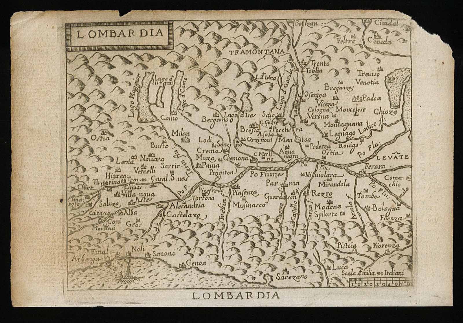 Piccola carta geografica (miniature map) raffigurante il territorio della Lombardia.