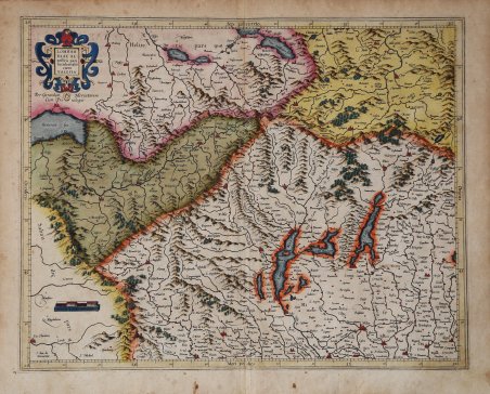 La carta viene preparata da ' Gerard Mercator per il suo ' Italia, Sclavoniae et Graeciae tabula geographicae ' (Duisburg, 1589) che comprende un frontespizio allegorico e 22 carte geografiche della penisola, dei Balcani e della Grecia. Successivamente le carte sono ristampate nell’Atlantis Pars Altera ' (1595) ' pubblicato postumo alla morte del Mercatore, dallo stampatore di Duisburg ' Albert Buys, sotto la supervisione del figlio Rumold Mercator. Composto da sei parti – pubblicate separatamente tra il 1589 e il 1594 – comprende 107 mappe, tutte tranne la carta del mondo di Rumold, firmate da Gerard Mercator. Le lastre vennero poi acquistate da Jodocus Hondius, che tra il 1606 e il 1630 le utilizzò per il suo ' Atlas Sive Cosmographicae Meditationes de Fabrica Mundi, integrandole ed aggiornandole con proprie “nuove” carte. Delle mappe di Mercator sono note anche ristampe curate da Johannes Janssonius. Le edizioni Hondius e Janssonius ebbero un grande successo commerciale e furono stampate in più lingue, con il testo al verso della carta in latino, francese, tedesco e olandese. La carta è incisa con i connotati tipici dell'opera mercatoriana. Le montagne sono allineate in un concetto di area montuosa, non per indicare vere catene o valli, ed hanno una struttura con qualche differenza nella dimensione, ma simile per quanto riguarda la forma, con pendici verticali e cime piatte. Le città sono mostrate attraverso castelli più o meno grandi caratterizzati da tetti slanciati ed aguzzi, simili a cappelli di mago. ' ESEMPLARE DALLA PRIMA EDIZIONE DI ' ATLANTIS PARS ALTERA. ' Incisione in rame, in buono stato di conservazione. Bibliografia cfr. Koeman II Me 11 e Koeman II Me 13A, 1595); Van der Krogt 1:002; J. Keuning, ' The History of an Atlas, in “Imago Mundi” IV (1947) pp. 37-43; ' World Encompassed ' p. 134. The map is prepared by Gerard Mercator for his ' Italia, Sclavoniae et Graeciae tabula geographicae ' (Duisburg, 1589), which includes an allegorical frontispiece and 22 maps of Italy, the Balkans and Greece. Later, the maps are reprinted in the ' Atlantis Pars Altera ' (1595) published posthumously after the death of Mercator, by the Duisburg printer Albert Buys, under the supervision of his son Rumold Mercator. Composed of six parts - published separately between 1589 and 1594 - it includes 107 maps, all except Rumold's map of the world, made by Gerard Mercator. The plates were then purchased by Jodocus Hondius, who between 1606 and 1630 used them for his ' Atlas Sive Cosmographicae Meditationes de Fabrica Mundi, ' integrating and updating them with his own "new" maps. Of Mercator's maps are also known reprints edited by Johannes Janssonius. The Hondius and Janssonius editions had a great commercial success and were printed in several languages, with the text on the back of the map in Latin, French, German and Dutch. The map is engraved with the typical connotations of Mercatorian work. The mountains are aligned in a mountainous area concept, not to indicate true chains or valleys, and have a structure with some differences in size, but similar in shape, with vertical slopes and flat tops. The cities are shown through more or less large castles characterized by slender and pointed roofs, similar to wizard hats. Copper engraving, in good condition. Bibliografia cfr. Koeman II Me 11 e Koeman II Me 13A, 1595); Van der Krogt 1:002; J. Keuning, ' The History of an Atlas, in “Imago Mundi” IV (1947) pp. 37-43; ' World Encompassed ' p. 134 Cfr.