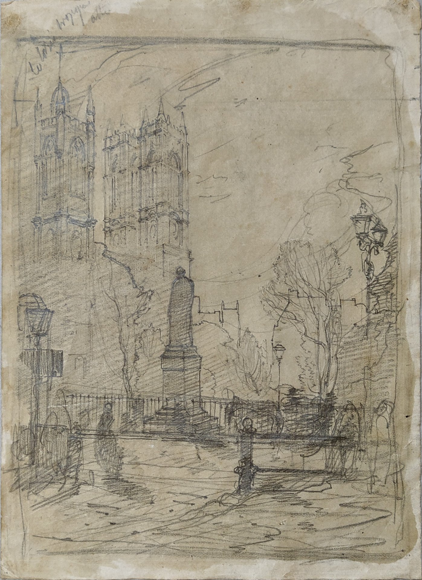 Trattasi del disegno preparatorio per il clichè-verre facente parte dell’album “Sketches of London by A. Fontanesi”, costituito da undici tavole comprese il frontespizio e pubblicato nel 1866. Il disegno è completamente ripassato a stecco per il trasporto su lastra.