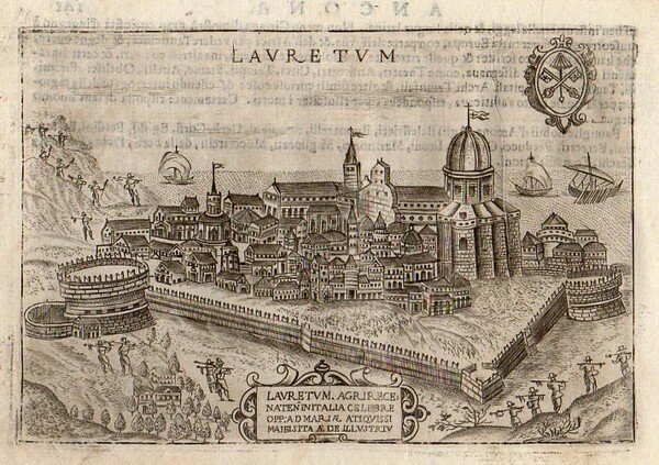 LORETO "Lauretum". Titolo centrale in alto e cartiglio in basso, bella veduta del complesso della Santa casa, con barche sullo sfondo e pellegrini in primo piano