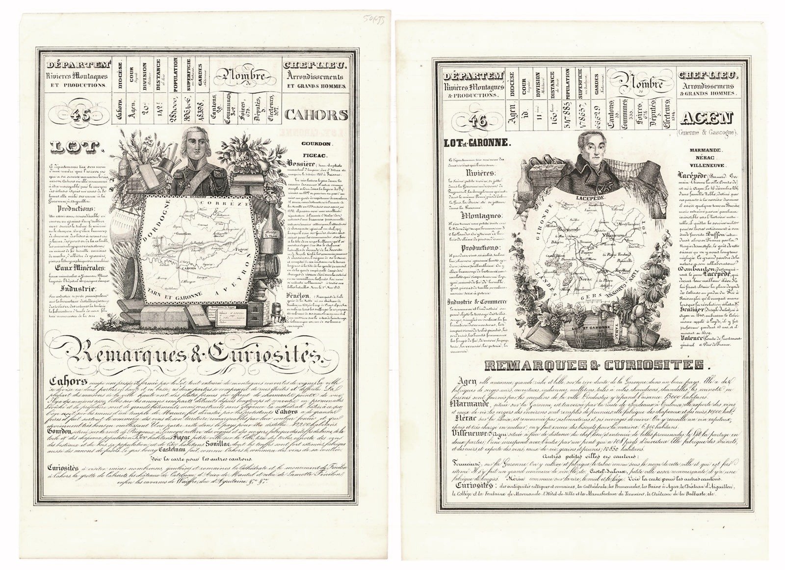 Carta n°45 del Dipartimento di Lot inserita in un medaglione centrale sormontato da un ritratto di Bessière. Questa è circondata da spiegazioni e osservazioni riguardanti l'economia, la geografia e la storia di quel territorio in cui si evidenziano le cittadine di Cohors, Gourdon, Figeac.Al retro la carta n° 46 del Dipartimento di Lot et Garonne inserita in un medaglione centrale sormontato da un ritratto di Bernard Lacépède. Anche questo è circondato da spiegazioni e osservazioni riguardanti l'economia, la geografia e la storia di quel territorio in cui si evidenziano le cittadine di Agen (Guienne & Gascogne), Marmande, Nérac, Villenueve.Inserita nell'opera "Nouvelle Géographie et Statistique de La France Alger et La Belgique, Suive d'un Traité sur le Mone entier. Ornée de 95 cartes approuvée de l'Université pa J. Henry, maitre de Pension" edita dall'Autore Alexandre Corbin Litografo ed editore a Tours nel 1842