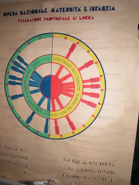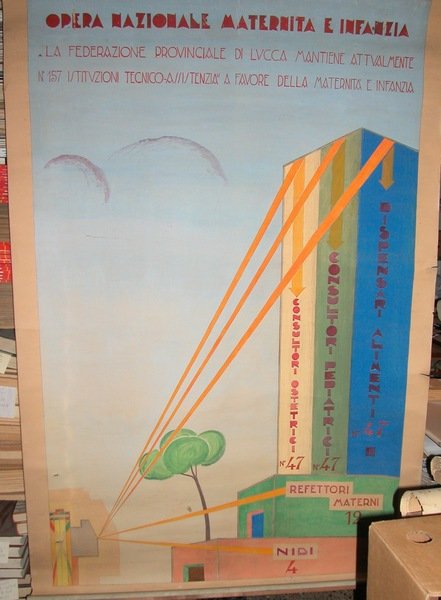 Tre grandi manifesti, disegnati e dipinti a mano, che riproducono graficamente l'attività della sezione lucchese dal 1928 al 1935. Sono riportate le statistiche dell'attività della Federazione, con le sue 157 istituzioni tecnico assistenziali a favore della maternità e dell'infanzia, di cui 47 Consultori ostetrici, 47 Consultori pediatrici, 47 Dispensari alimenti, 12 Refettoiri materni, 4 Nidi, il numero delle madri e bambini assistiti nel periodo (52001) e le spese sostenute (Lit.5.178.431). Manifesti rispettivamente in formato cm.188x127; cm.180x125; cm.179x150. Alcuni strappi e mancanze, vistose chiazze sui retro. I disegni, supportati da listelli di legno, costituivano probabilmente l'apparato grafico di una mostra dell'"Opera Maternità e Infanzia", allestita a Lucca intorno al 1936. Di particolare interesse il colpo d'occhio cromatico, con una grafica tipicamente autarchica. il lotto. Codice libreria 37641.