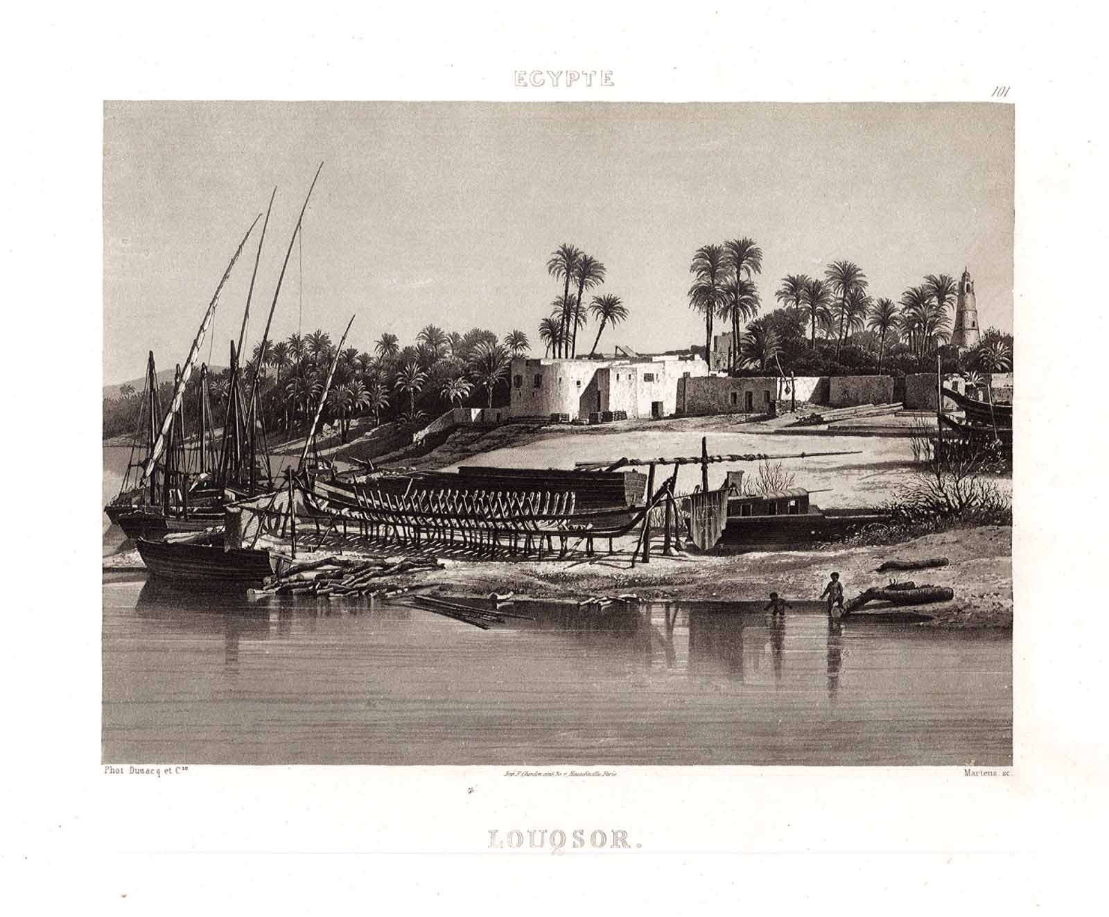 Stampa, antica ed originale, di Luxor. Inserita nell'opera "Excursions photographiques. Vues et monuments les plus remarquables de l'univers.". Parigi 1863. Autore: Martens sculp. Luogo: Luxor - Egitto. Anno: 1863. Tecnica: acquatinta. Dimensioni: 270x370 il foglio.