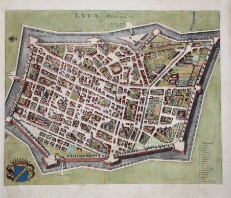 Guardando quasi verso nord, questa veduta di Lucca è rappresentata da un punto di osservazione direttamente sopra la città. La prospettiva rigorosa crea alcune distorsioni ottiche nella rappresentazione degli edifici. La cinta muraria (1504-1645), ancora esistente, racchiude ordinatamente lo spazio urbano all'interno di fossati e bastioni. Immediatamente riconoscibile in alto al centro è la Piazza dell'Anfiteatro, che descrive quasi un cerchio completo. La chiesa principale della città, la cattedrale di San Martino, con il suo campanile e la piazza antistante, è visibile ai margini inferiori della città, sopra il bastione. Al centro a sinistra si trova San Michele in Foro, immerso nel verde. Pianta prospettica edita, per la prima volta, da Johannes Janssonius nel 1657 circa. Si tratta di una copia fedele della stampa di Braun e Hogenberg del 1575 con delle varianti. Esemplare ' stampato ' da Pieter Vander Aa nel 1723, inserita nel ' Thesaurus antiquitatum et historiarum Italiae. Lugduni Batavorum, excudit Petrus van der Aa. MDCCXXIII. È una copia molto attenta della pianta di Braun-Hogenberg. Per la prima volta viene pubblicata nella raccolta di Johannes Janssonius, ' Theatrum urbium Italiae aliarumque in insulis Maris Mediterraneae, Amsterdam s.d. (1657 circa), vol. V. Janssonius si propose di rinnovare il successo riscosso dalle ' Civitates orbis terrarum ' del Braun e riuscì ad acquistare in blocco la raccolta di rami dagli eredi dell'ultimo editore-incisore dell'opera di Colonia; eliminati quelli più deteriorati, ne aggiunse parecchi di nuovi, dando origine ad una splendida edizione ricca di tavole decorate da cartigli e cornici di gusto barocco, motivi cari all'autore che comprese le istanze del suo secolo e se ne fece portavoce. […] Alla fine del secolo Frederik de Witt, che già aveva al suo attivo edizioni di carte e di atlanti, venne in possesso dei rami pubblicati dallo Janssonius e preparò una nuova edizione intitolata ' Theatrum praecipuarum totius Europae urbium tam icono- graphice quam cospicue delineatarum, Amsterdam s.d. (1680 circa). ' Infine, la lastra viene in possesso dell’editore Pieter Vander AA che la utilizza per illustra l’opera di Johan Georg Graevius, ' Thesaurus antiquitatum et historiarum Italiae, collectus cura et studioJ. G. Graevii, et ad finem perductus a P. Burmanno. Leida, Peter van der Aa, 1704-1723; l'opera comprende 9 parti divise in 30 volumi; la pianta di Lucca compare nell’ultimo volume, ad illustrare il testo di Martino Menfredi, Monumentarum Historicum Urbis Lucae Libri Quinque. Acquaforte, finemente colorata a mano, in ottimo stato di conservazione. Bibliografia D. Cremonini, L’Italia nelle vedute e ' carte geografiche, p. 82, n. 198. ' Perspective plan edited by Johannes Janssonius in about 1657. This is a faithful copy of the 1575 print by Braun and Hogenberg with variations in the position and composition of the cartouche. Example published by Pieter Vander Aa in 1723, included in ' Thesaurus antiquitatum et historiarum Italiae. Lugduni Batavorum, excudit Petrus van der Aa. MDCCXXIII. This is a very careful copy of Braun-Hogenberg's. It is first published in the collection of Johannes Janssonius, ' Theatrum urbium Italiae aliarumque in insulis Maris Mediterraneae, Amsterdam s.d. (c. 1657), vol. V. Janssonius set out to renew the success enjoyed by Braun's ' Civitates orbis terrarum ' and succeeded in acquiring en bloc the collection of copperplates from the heirs of the last publisher-engraver of the work in Cologne; having eliminated the most deteriorated ones, he added several new ones, resulting in a splendid edition full of plates decorated with cartouches and frames in the Baroque style, motifs dear to the author, who understood the instances of his century and made himself its spokesman. [.] At the end of the century, Frederik de Witt, who already had to his credit editions of maps and atlases, came into possession of the branches published by Janssonius and prepared a new edition entitled ' Theatrum praecipuarum totius Europae urbium tam icono- graphice quam cospicue delineatarum, Amsterdam s.d. (c. 1680). Finally, the plate came into the possession of publisher Pieter Vander AA, who used it to illustrate the work of Johan Georg Graevius, ' Thesaurus antiquitatum et historiarum Italiae, collectus cura et studioJ. G. Graevii, et ad finem perductus a P. Burmanno. Leiden, Peter van der Aa, 1704-1723; the work comprises 9 parts divided into 30 volumes. Bibliografia D. Cremonini, L’Italia nelle vedute e carte geografiche, p. 82, n. 198. ' ' ' Cfr.
