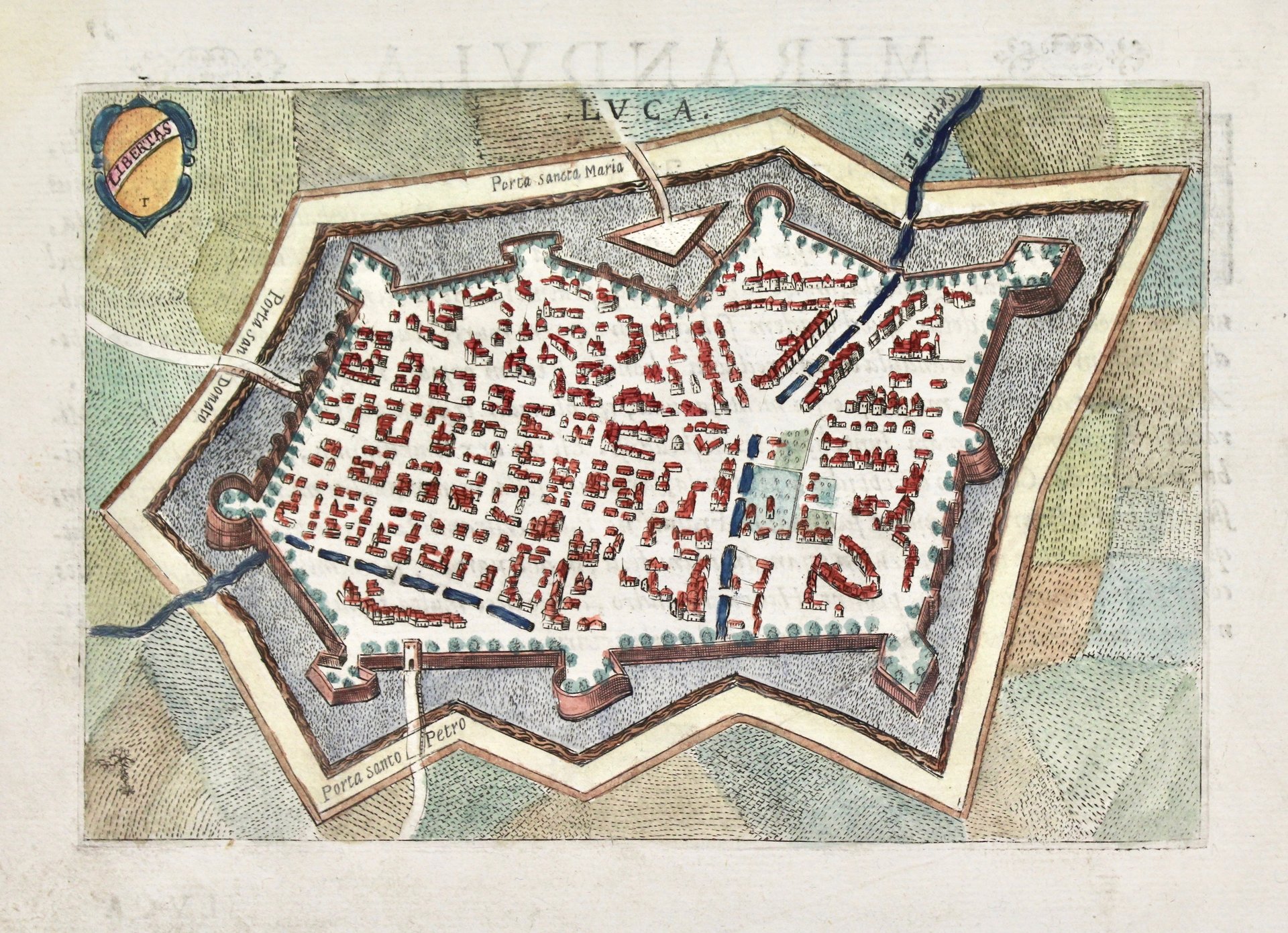 Incisione in rame, mm 120x179, dipinta a mano. Tratta da "Theatrum urbium Italicarum" prima edizione di questa raccolta di piante e vedute di città (senza dubbio da preferire per freschezza di stampa delle lastre alla successiva), ristampata successivamente a Vicenza nel 1616 da Domenico Amadio con l'aggiunta di alcune tavole (67 tavole invece delle 59 originali). Testo latino, pertinente però alla tavola precedente, al verso, di autore ignoto, anche se alcuni studiosi ipotizzano sia dello stesso Bertelli. Buon esemplare.
