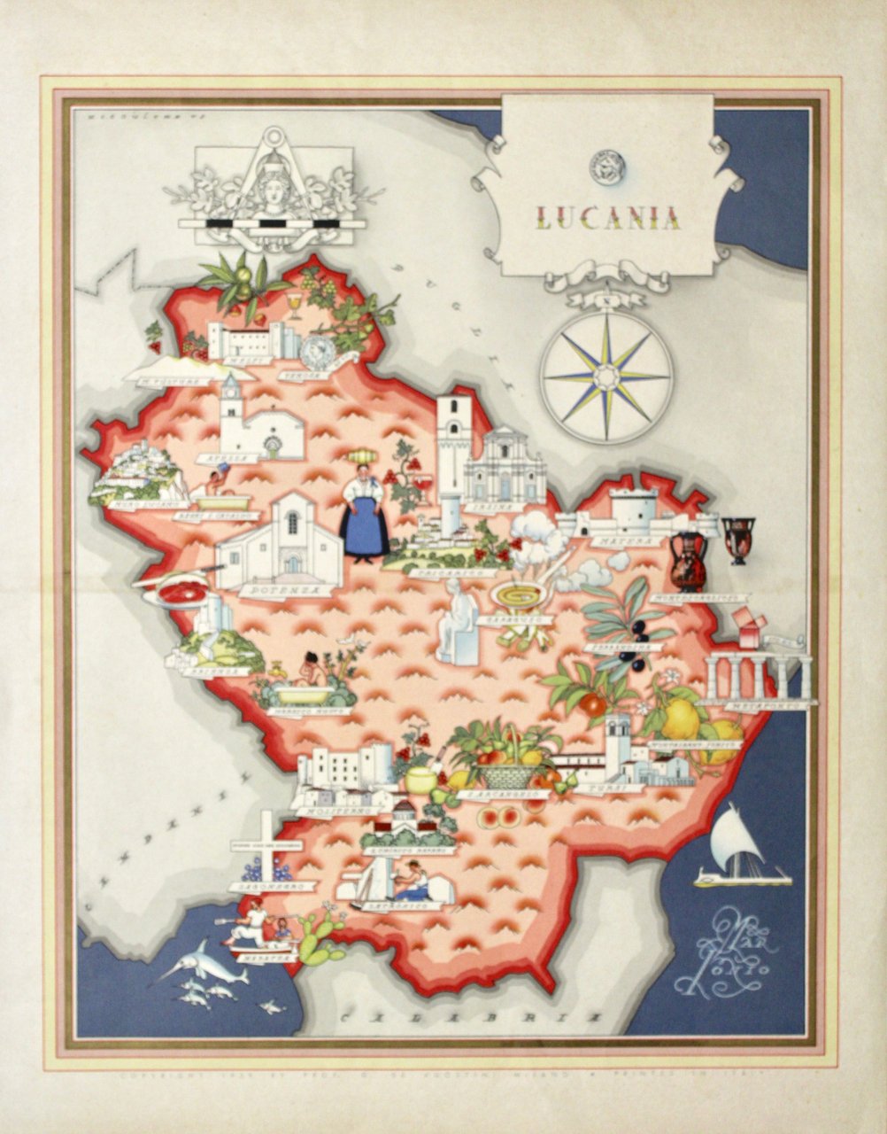 Cromolitografia, mm 480x480, firmata "Niculine Vs". Tratta da "Imago Italiae" pubblicato da De Agostini<BR>Curiosa ed assai decorativa carta della regione che mette in mostra i principali monumenti. L'autore Vsevolode Petrovi? Nicouline nacque nel 1890; fu costretto all'esilio dopo la vittoria di Lenin; si trasferì in Italia dove si sposò, visse e morì lavorando come noto illustratore per pubblicità, riviste ed altro. Ottimo esemplare. <BR><BR>