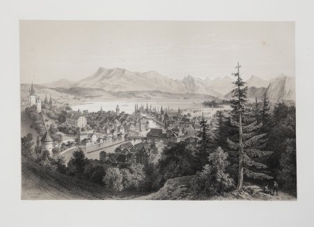 Veduta tratta dal Pittoresk resetour fran Stockholm till Neapel- Published by Genom Sverge, Danmark, Tyskland, Holland, Belgien, Frankrike, Schweitz, Tyrolen, Savojen, Italien. 100 vuer teknade efter naturen, lithographierade och uitgifne af C.J. Billmark. Stockholm, J. C. Hedbom, 1852. Le litografie rappresentano vedute di paesaggi e scorci di città incontrati da Billmark nel suo viaggio da Stoccolma a Napoli. Billmark, pittore e litografo svedese, fu inizialmente allievo dell’incisore Forsell. ' Per la sua carriera artistica di paesaggista furono importanti i viaggi nella Contea di Dalarna, San Pietroburgo e Parigi, dove si trasferì e studiò con l’incisore Deroy. Dal 1828 al 1830, mentre era a Parigi, pubblicò 100 studi litografici sul paesaggio. Fu membro dell’Accademia di Stoccolma e nel Museo svedese, oggi sono esposte numerose sue vedute della città tra disegni e schizzi. ' Ricevette la decorazione dell’ordine Wasa. Sicuramente tra i lavori di maggior interesse fu la pubblicazione di 100 tavole (tra cui questa) contenute nell’opera Pittoresk Resetour fran Stockholm till Neapel stampata a Stoccolma e Parigi nel 1852, che rappresenta il resoconto iconografico del viaggio che parte da Stoccolma e si sofferma lungamente a Napoli e dintorni. Il libro Illustra il viaggio dalla Svezia all’Italia, attraverso Danimarca, Olanda, Francia, Svizzera, Tirolo, Savoia con magnifiche litografie stampate su fondo seppia e ritoccate di bianco da Billmark. Litografia tinta, in ottimo stato di conservazione. View taken from Pittoresk resetour fran Stockholm till Neapel- Published by Genom Sverge, Danmark, Tyskland, Holland, Belgien, Frankrike, Schweitz, Tyrolen, Savojen, Italien. 100 vuer teknade efter naturen, lithographierade och uitgifne af C.J. Billmark. Stockholm, J. C. Hedbom, 1852, published in Stockholm. The lithographs depict views of landscapes and cityscapes that Billmark encountered on his journey from Stockholm to Naples. Billmark, Swedish painter and lithographer, was initially a student of engraver Forsell. ' Important to his artistic career as a landscape painter were trips to Dalarna County, St. Petersburg, and Paris, where he moved and studied with the engraver Deroy. From 1828 to 1830, while in Paris, he published 100 lithographic landscape studies. He was a member of the Stockholm Academy and in the Swedish Museum, today are exposed many of his views of the city between drawings and sketches. ' He received the decoration of the Wasa order. Certainly among the works of greatest interest was the publication of 100 plates (including this one) contained in the work Pittoresk Resetour fran Stockholm till Neapel printed in Stockholm and Paris in 1852, which represents the iconographic account of the journey from Stockholm to Naples and its surroundings. The book illustrates the journey from Sweden to Italy, through Denmark, Holland, France, Switzerland, Tyrol, and Savoy with magnificent lithographs printed on a sepia background and retouched in white by Billmark. Tinted lithograph in excellent condition. Cfr.