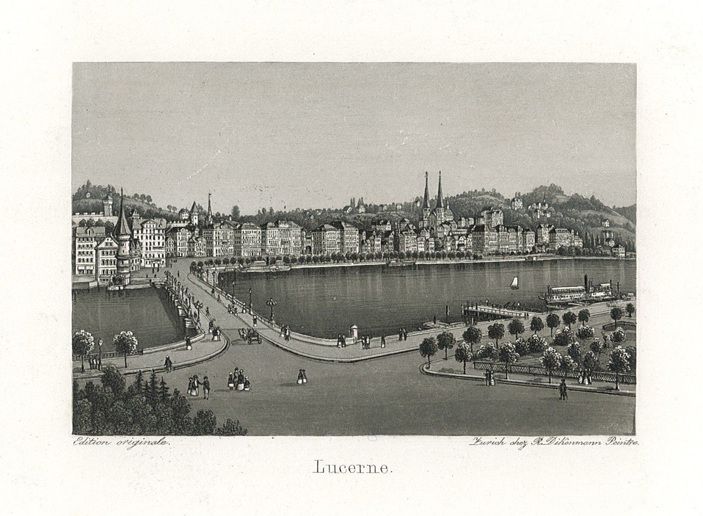 Stampa, antica ed originale, raffigurante illungo lago di Lucerna in raffinata acquatinta. Inserita nell'opera "Souvenir de la Suisse" edita a Zurigo. Autore: Dikenmann Rudolf dis. (1793 Zürich 1883). Anno: 1860 ca. Tecnica: acquatinta. Dimensioni: 74x112 mm
