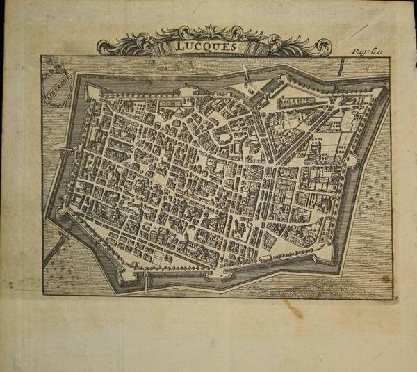 LUCQUES. Pianta assonometrica della città di Lucca, da sud, tratta da "Les Delices de l'Italie, ou Description exacte de ce Pays, de ses principales villes, de toutes les Antiquitez, & de toutes les raretez, qui s'y trouvent, Par les S.rs De Rogissart, & H.***".