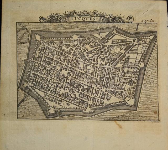 Prima edizione. Incisione su rame originale di Joseph Mulder in formato cm.15x12 alla battuta. > Ricci, "La rappresentazione cartografica del territorio e l'iconografia urbana della città di Lucca nelle stampe dal XV al XIX secolo", 19, "Riproposizione della rappresentazione del Merian . alla quale in questo caso sono aggiunti alcuni motivi decorativi,si veda lo stemma della repubblica con motto, il cartiglio a volute con l'inserimento del nome .". Codice libreria 162264.