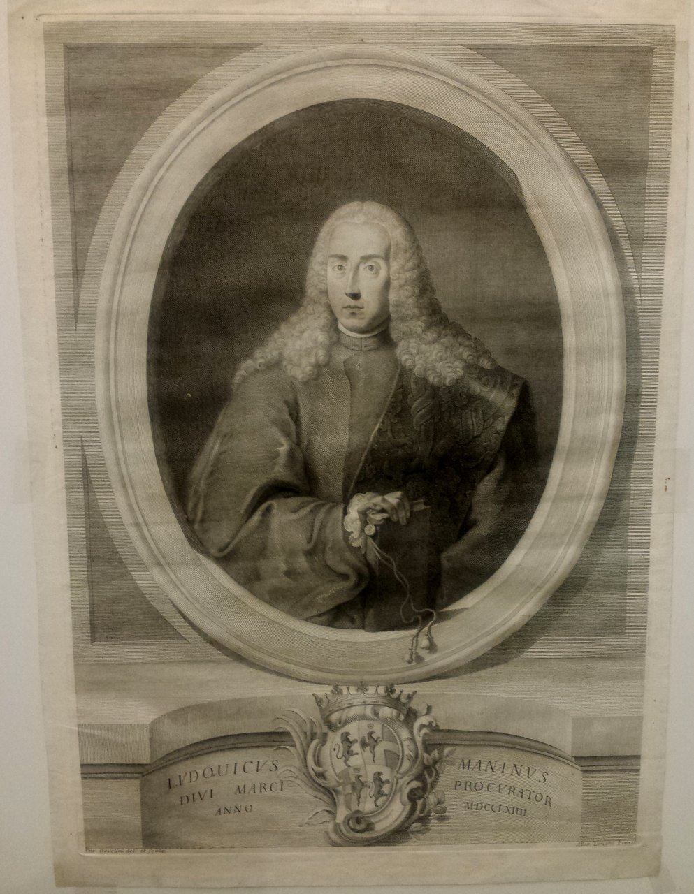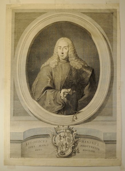 Incisione all'acquaforte di mm 375 x 530 alla battuta su carta vergata veneziana di gran corpo. Ottimo esemplare con buoni margini esterni. Sotto il medaglione il blasone dei Manin e la seguente iscrizione : "Ludovicus Maninus Divi Marci Procurator Anno MDCCLXIIII" e in piccolo sotto l'immagine a sinistra "Car. Orsolini del: et sculp." e a destra : "Alles. Longhi Pinxit". La incisione rappresenta infatti il futuro ultimo Doge di Venezia nell'occasione della sua entrata a Procuratore di San Marco, massima carica dello Stato dopo quella del Doge. Carlo Orsolini nacque a Venezia verso il 1704 e ivi morì nel 1784. Secondo il Moschini : "contendeva vanamente del primato nell'intaglio con Giannatonio Faldoni, avendone tutti e due avuta principalmente la stessa maniera a un solo taglio".
