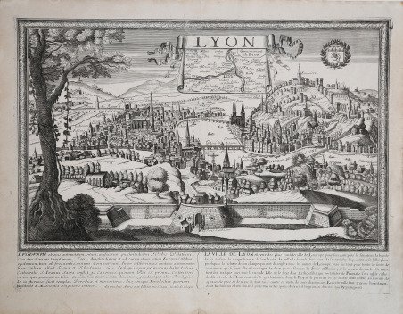 Rarissima pianta prospettica di Lione, pubblicata a Parigi nel 1667 circa, come indicato dall'imprint in basso "Se Vendent A Paris chez Jollain rue S. Iacque a la Ville de Cologne". L'autore ed editore Francois Jollain, del quale si conoscono pure varie carte geografiche raccolte nell'opera: ' Tresor des cartes geographiques, ' Paris, rue S. Jacques à la ville de Cologne [1667]" (cfr. Da Mareto, ' Parma e Piacenza nei secoli, p. 55). Acquaforte, stampata su carta vergata coeva, in eccellente stato di conservazione. Rarissima. Very rare perspective plan of Lyon, published in Paris in about 1667, as indicated by the imprint at the bottom "Se Vendent A Paris chez Jollain rue S. Iacque a la Ville de Cologne". Francois Jollain published a number of maps and views (all very rare). We know his ' Tresor des cartes geographiques, ' Paris, rue S. Jacques à la ville de Cologne [1667] (cfr. Da Mareto, ' Parma e Piacenza nei secoli, p. 55). Etching, printed on contemporary laid paper, in excellent condition. Very rare. Cfr.