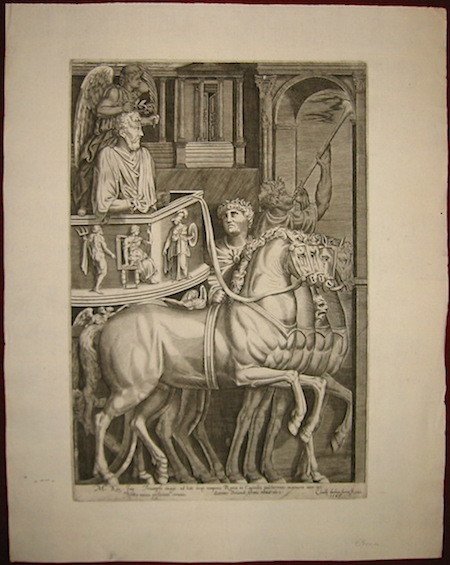 Incisione originale su rame (cm. 28,3x41,8 più ampi margini bianchi). Carta vergellata con filigrana. Alcuni minuscoli forellini di tarlo sui margini bianchi, ma esemplare in ottimo stato di conservazione. Doppio imprint nella parte inferiore dello specchio di stampa: ‘Claudij ducheti formi Roma. 1583’ e ‘Ioannes Orlandi formis romae 1602’. Copia dell’edizione lafreriana di Nicolas Beatrizet del 1560. Corsi-Ragionieri, n. 11; Rubach, n. 311. Si tratta di un’incisione di traduzione di un bassorilievo, oggi conservato ai Musei Capitolini, proveniente dall’arco di trionfo eretto nel 176 d.C. nel Foro Romano per celebrare le vittorie dell’Imperatore Marco Aurelio sui Germani e sui Sarmati. Antoine Lafrery (Antonio Lafreri nella forma italianizzata), incisore, editore e mercante di stampe curò la pubblicazione tra il 1544 ed il 1575 di una serie di circa 200 incisioni - raffiguranti perlopiù monumenti ed antichità romane ed opera di diversi autori - nota come ‘Speculum Romanae Magnificentiae’. Le stampe erano poste in vendita sia singolarmente che sotto forma di raccolta con un numero spesso variabile di fogli. Dal 1574 iniziò a circolare anche una tavola-frontespizio dello ‘Speculum’, attribuita a Etienne Duperac. Successivamente, tra il tardo Cinquecento ed il Settecento, i rami lafreriani conobbero tirature posteriori con l’imprint di vari editori ed il contributo di diversi incisori. Inoltre lo ‘Speculum’ fu ampliato nel tempo mediante l’aggiunta di altre tavole il cui minimo comune denominatore appare quello di riprodurre opere antiche e moderne di Roma.