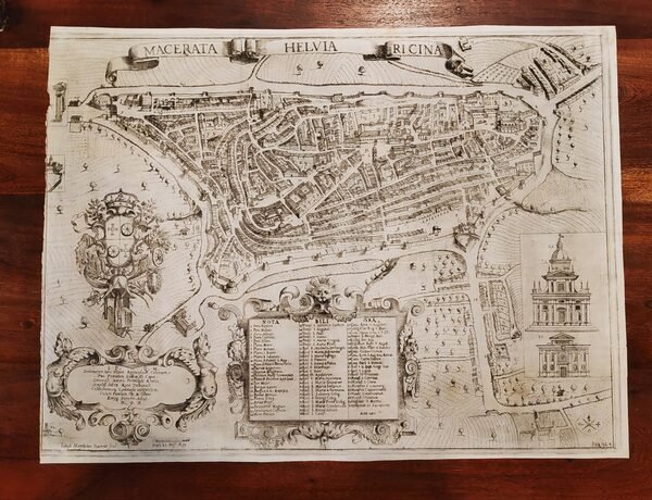 MACERATA - Mattheius, Joseph. "Macerata Helvia Ricina". Titolo in alto lungo il margine superiore, in basso due cartigli ornati con dedica ed elenco dei luoghi notabili, grande stemma ornato e "Joseph Mattheius Macerat. sculp.".