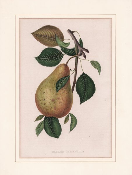 Litografia a colori, 1853-1860, impressa su carta coeva, in perfetto stato di conservazione. La tavola è tratta dagli ' Annales de pomologie belge et étrangère ' (1853-1860) una rivista illustrata di pomologia pubblicata annualmente dalla Commission Royale de Pomologie belga, con Alexandre Bivort come segretario del comitato di redazione (di fatto direttore). Fu stampato a Bruxelles, prima da F. Parent (1853-1858) e poi dalla sua vedova e dal figlio (1859-1860). ' Oltre allo stesso Bivort, contribuirono agli Annales Charles ed Ernest Baltet, Laurent de Bavay, Jules de Liron d'Airoles, Antoine-Joseph Gailly, Charles Auguste Hennau, Alfred Loisel, Auguste Royer, Félix Sahut e Michel Scheidweiler. Alexandre Joseph Désiré Bivort (1809-1872) è stato un orticoltore belga, specializzato in pomologia. Fu particolarmente influente nella sistematizzazione della nomenclatura delle varietà di pere. Educato alla scuola industriale di Melle e al collegio di Aalst, dedicò molto del suo tempo allo studio dell’agricoltura, diventando alla fine un orticoltore a tempo pieno. Nel 1840 acquistò la collezione di semi di Jean-Baptiste Van Mons, che contava circa 20.000 semi, e gradualmente la trasportò nella sua proprietà a Saint-Remy-Geest. Nel 1854 divenne il direttore della Société Van Mons. Corrispondeva con molti importanti pomologi internazionali ed era il segretario del comitato di redazione degli ' Annales de pomologie belge et étrangère ' della Commission Royale de Pomologie (1853-1860), a cui contribuì in modo sostanziale. Bibliografia Émile Rodigas, "À la mémoire d’Alexandre Bivort", Bulletins d’arboriculture, de floriculture et de culture potagère ' (1872), p. 275; Anne-Marie Bogaert-Damin, "L’illustration des revues d’horticulture en Belgique au XIXe siècle", In Monte Artium, 7 (2014), pp. 155-176. Colour litograph, 1853-1960, printed on contemporary paper, good condition. The plate is taken from ' Annales de pomologie belge et étrangère (1853–1860), an illustrated pomology review published annually by the Belgian Commission Royale de Pomologie, with Alexandre Bivort as secretary of the editorial committee (effectively editor in chief). It was printed in Brussels, first by F. Parent (1853-1858) and then by his widow and son (1859-1860). ' Apart from Bivort himself, contributors to the Annales included Charles and Ernest Baltet, Laurent de Bavay, Jules de Liron d’Airoles, Antoine-Joseph Gailly, Charles Auguste Hennau, Alfred Loisel, Auguste Royer, Félix Sahut, and Michel Scheidweiler. Alexandre Joseph Désiré Bivort (1809–1872) was a Belgian horticulturalist, specialising in pomology. He was particularly influential in systematising the nomenclature of strains of pear. He devoted much of his time to the study of griculture, eventually becoming a full-time horticulturalist. In 1840 he acquired the seed collection of Jean-Baptiste Van Mons, numbering about 20,000 seeds, and gradually transported it to his own property at Saint-Remy-Geest. In 1854 he became the director of the Société Van Mons. He corresponded with many leading international pomologists, and was the secretary of the editorial committee of the Commission Royale de Pomologie's ' Annales de pomologie belge et étrangère ' (1853–1860), to which he was a substantial contributor. Bibliografia Émile Rodigas, "À la mémoire d’Alexandre Bivort", Bulletins d’arboriculture, de floriculture et de culture potagère ' (1872), p. 275; Anne-Marie Bogaert-Damin, "L’illustration des revues d’horticulture en Belgique au XIXe siècle", In Monte Artium, 7 (2014), pp. 155-176. Cfr.