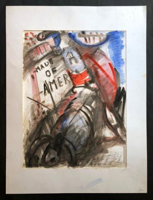 1978. Lapis e acquarellosu cartoncino bianco liscio, cm 48,5 x 64,5 (l'intero cartoncino). In basso a destra la firma “Paoli 78”. Disegno e colore si intrecciano in una soluzione grafica di buon effetto, anche coloristico, per quanto il colore sia giocato soltanto su pochi colori. Franco Paoli (Rio Marina, 1933 - 2011) pittore, scultore e poeta. Pittore “irrazionale” Paoli non diventa labronico: il suo è uno stile caldo che si manifesta in colori e forme di autonoma invenzione che rompono il limite fra figura e colore: ritratti, gruppi di figure, vedute e marine, nature morte richiamo la maniera di Cézanne con di scavare nell’animo dei soggetti. Negli anni ‘70 è componente attivo del gruppo de “Gli irrazionali” insieme a Paolo Bottai, Mauro Gani, Guido Guideri, Enrico Mori e Ellenio Mischi; negli anni ‘90 aderisce all’esperienza dei “Tintori”. Espone in Italia e all’estero ricevendo numerosi premi e consensi. .