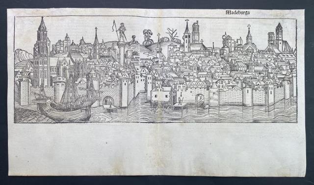 Dal “Liber Chronicarum Nurembergensi”, Anton Koberger, Norimberga, 1493. Xilografia stampata su doppia pagina, b/n, cm 30,5 x 54,5 circa (il foglio), al verso del foglio quattro figure e una cometa, testo in latino. La monumentale opera dello Schedel, il "Liber Cronicarum", rappresenta uno “dei più straordinari lavori mai realizzati” dall’editoria del XV secolo. Restauro professionale, margini del foglio rifilati con mancanza della parte testuale ma presente la filettatura di inquadratura della veduta. Discreto stato.