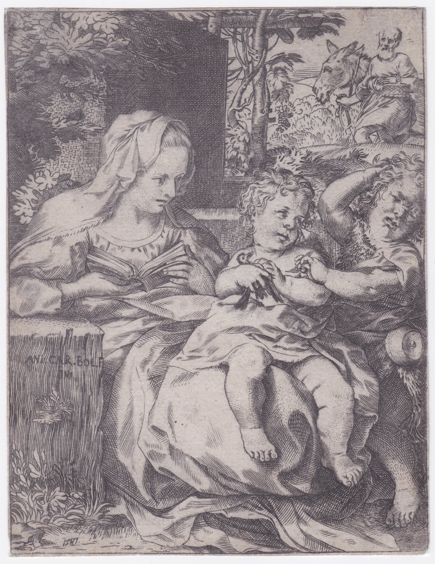 Soggetto di invenzione, composizione fitta e ricca di dettagli appartenente al periodo maturo di Annibale. La Vergine è distratta dalla lettura dalle urla di San Giovannino che offre un frutto ad una rondine che Cristo fanciullo sta accarezzando. Cristo osserva San Giovannino con uno sguardo serafico e interrogativo. La Vergine si appoggia a un plinto sul quale è inciso: ANI. CAR BOL. F / IN e 1587. Stato unico. La lastra è conservata presso la Calcografia Nazionale (M-323) di Roma e reca sul verso alcuni studi di teste e occhi, nessuno dei quali è direttamente collegato all'incisione del recto (De Grazia 10). Alcuni studiosi citano uno stato successivo con l'indicazione dello stampatore De' Rossi, ma non se ne conoscono esemplari.