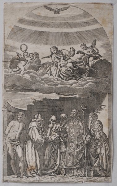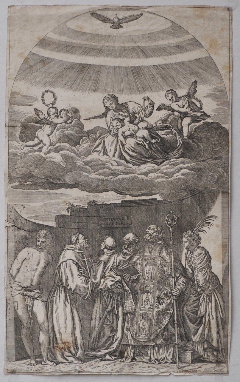 Acquaforte di mm 286 x 473 su carta di filo. La stampa, ricordata dallo Zanetti, riproduce in controparte la pala già nella chiesa di San Nicolò dei Frari a Venezia, prima che fosse tagliata la parte superiore centinata, in cui si trovava la colomba dello Spirito Santo.