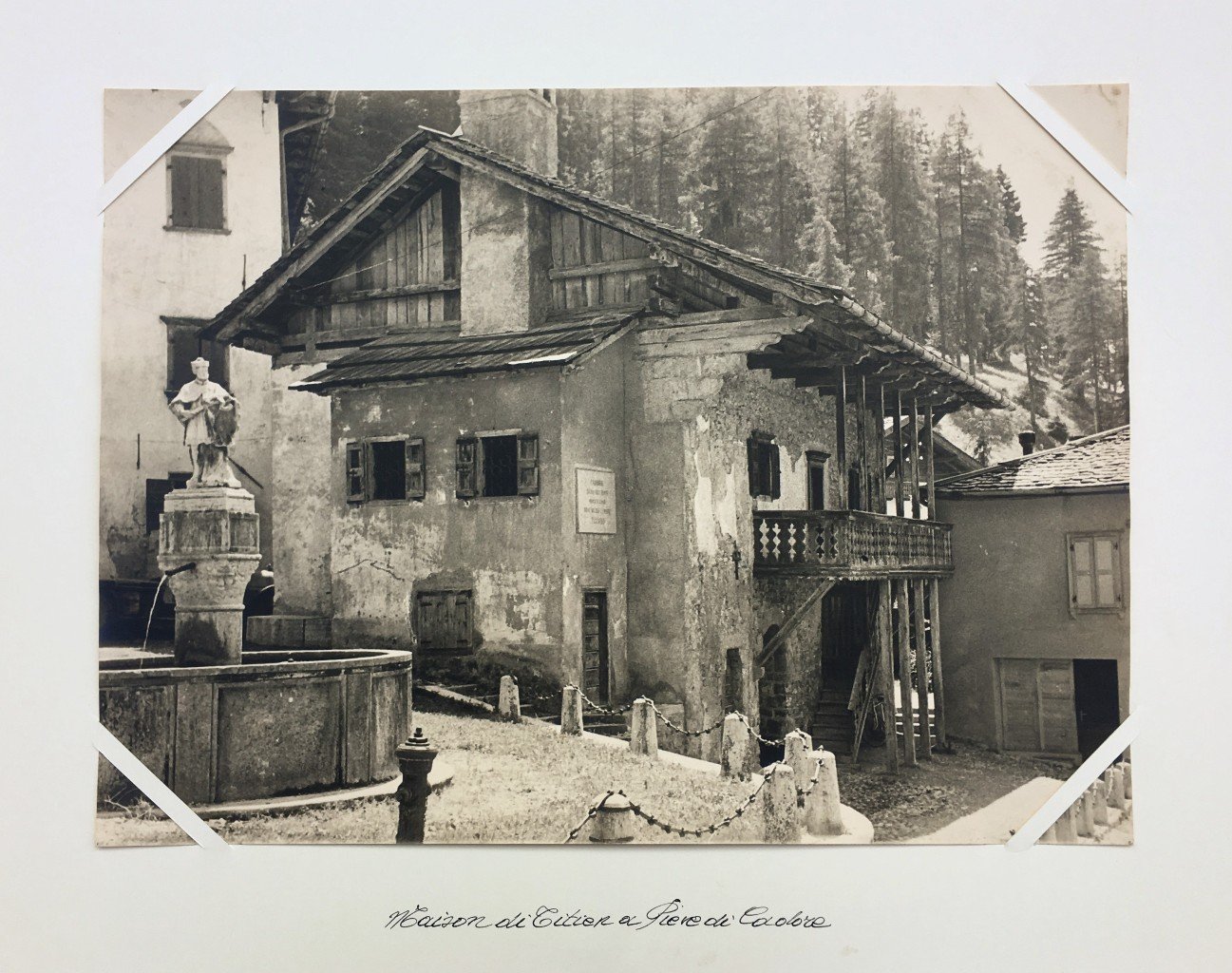 Bella e grande fotografia originale degli anni '50 con veduta di Casa del Tiziano nel centro di Pieve di Cadoreo, montata su cartoncino con angoli liberi