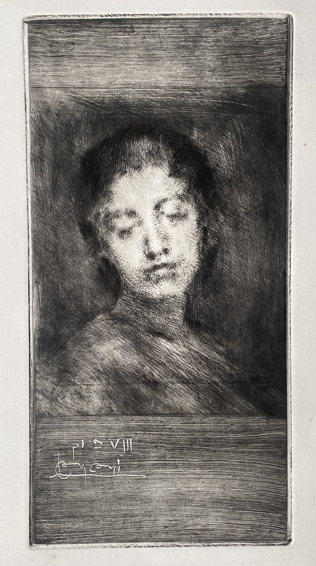 Nel foglio viene raffigurata una figura a mezzo busto di profilo con il volto rivolto all’osservatore. La donna nella sensibilità scapigliata è un modello che fonde il solido realismo lombardo con l’evanescente interpretazione simbolista. E’ questa una delle lastre in cui Conconi sperimenta maggiormente gli effetti pittorici delle velature d’inchiostro e del monotipo ottenendo esemplari molto differenti fra loro. Impressione con effetti di pulitura orizzontale del velo d’inchiostro nelle zone superiore e inferiore alla figura che resta così inquadrata a simulare una finestra. Iscrizione a monotipo sotto il soggetto: pr.a VIII e firma. Esemplare nel II/III stato con aggiunta di segni sul petto e sulla parte destra del collo.