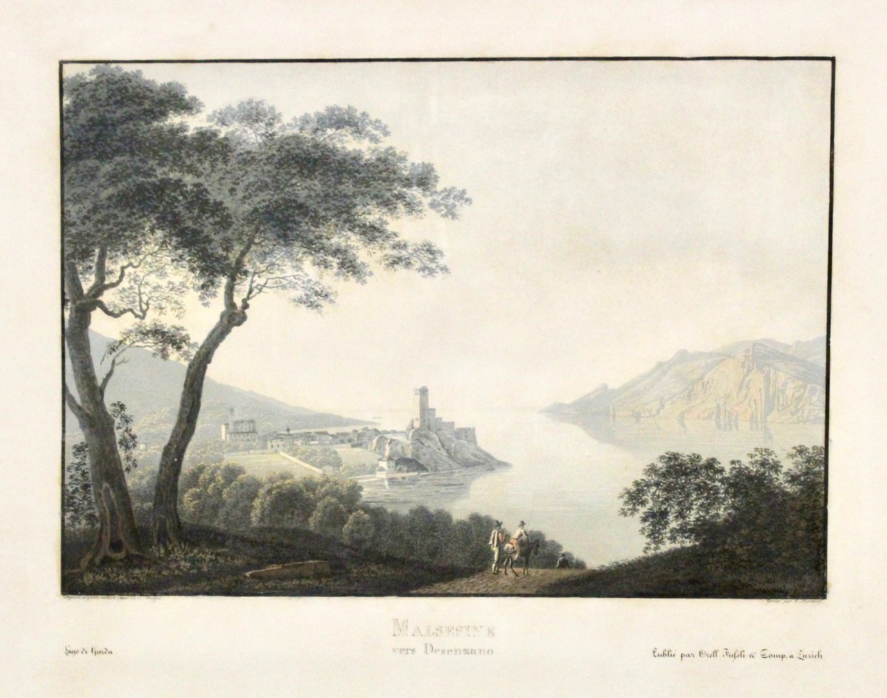 Acquatinta incisa in rame da C. Rordorf su disegno di Wetzel, dipinta d'epoca, mm 194x275 (parte incisa).Suggestiva veduta presa da nord col castello al centro; tratta dalla celebre opera " Voyage pittoresque au Lac de Garde ou Benaco " pubblicata da Orel Fussli, senz'altro la più ricercata ed elegante serie pubblicata sul lago di Garda. Esemplare professionalmente rinfrescato<BR>Sinistri-Spini " Il Garda nelle stampe ", 61. <BR>