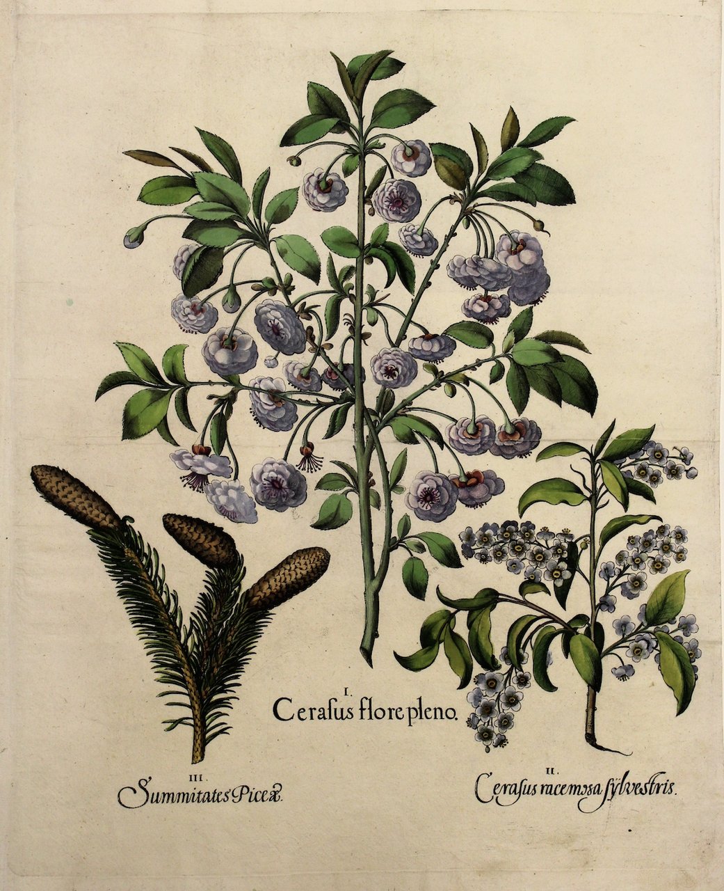 Incisione in rame, (mm 405x480 alla battuta) acquarellata. Bell’esemplare, lievissimo alone al margine inferiore che non entra nella battuta. Basilius Besler (1561-1629) botanico - farmacista pubblicò l'Hortus Eystettensis a Eichstätt vicino a Norimberga nel 1613. Si tratta di un erbario figurato di straordinaria bellezza, il tratteggio e l’effetto dei chiaro scuro dell’incisione donano plasticità e tridimensionalità alle piante, sono disposte in modo elegante artisticamente rivolte dalla parte più estetica, inoltre rappresenta le radici delle piante come sono realmente, nei particolari, con tale enfasi da chiedersi se non avesse abbracciato la teoria di Cesalpino, che diceva che nelle piante si poteva vedere la forma del corpo umano capolvolta. Le tavole saranno successivamente acquarellate da abili coloristi. Il paziente lavoro di Besler fu intrapreso in un periodo di sedici anni, usando, come modello per i suoi disegni, le piante del giardino dei semplici del vescovo - principe Johann Konrad Von Gemmingen, presso cui lavorava, che trasformò in un esempio di bellezza ornamentale. Le raffinate 374 tavole (con testo a fronte furono inserite in ordine cronologico dalla primavera all’autunno sulla base della fioritura) furono incise da un team di importanti incisori, quali Heinrich Ulrich. Realizzate in rame in acquaforte, in folio imperiale dai disegni originali dell’autore, raffigurano 1084 piante fiorite, erbe, vegetali provenienti anche dalle nuove scoperte geografiche, come il tabacco e il pepe e altre spezie. Besler era botanico e orticoltore, consapevole delle proprietà medicinali delle varie piante, inoltre ebbe la fortuna di vivere nel periodo giusto delle grandi scoperte, in cui le piante esotiche arrivavano in Europa da tutte le parti del mondo. L'Hortus Eystettensis, magnifico florilegio dell'inizio del Seicento, è un ricco inventario delle meraviglie della natura in una guida stagionale e sancisce un decisivo passaggio della tecnica incisoria nelle opere botaniche, dalla xilografica a quella calcografica. Basilius Besler l’Erbario delle quattro stagioni Utet – Garzanti.Tav. n°224