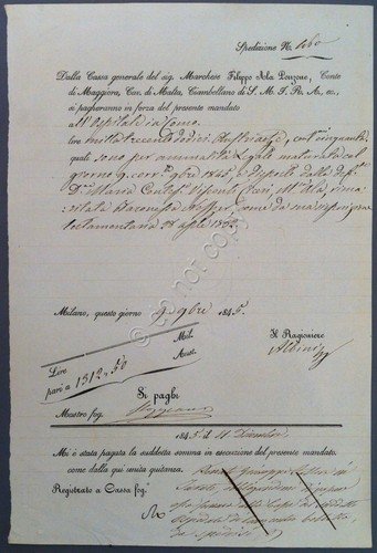 Mandato di Pagamento quietanzato - Marchese Filippo Ala Ponzone - Milano 1845