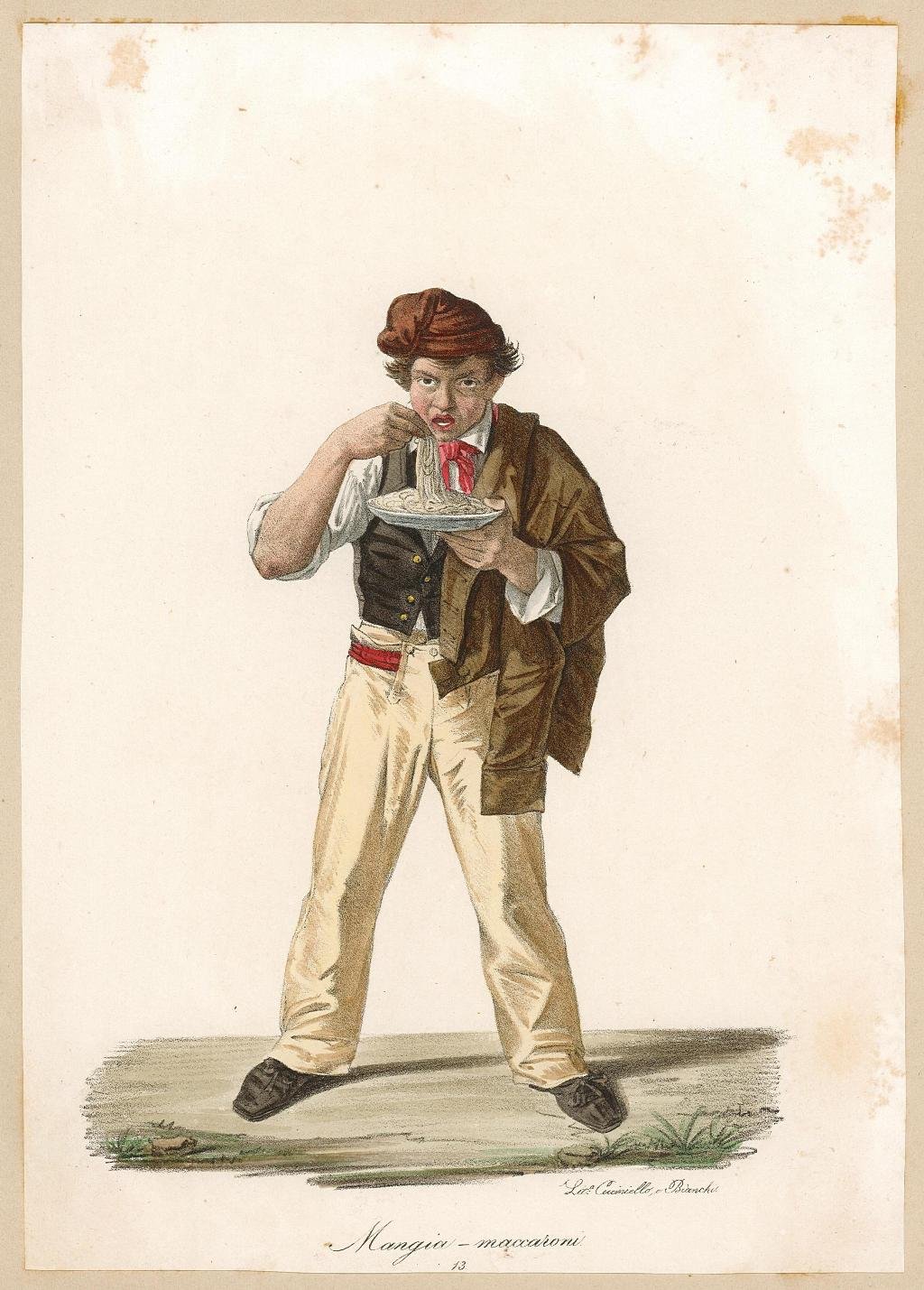 Litografia, antica originale, in bella coloritura coeva, raffigurante un mangiatore di pasta . L'incisione è ridimensionata al margine ed applicata all'epoca su di un supporto cartaceo coevo