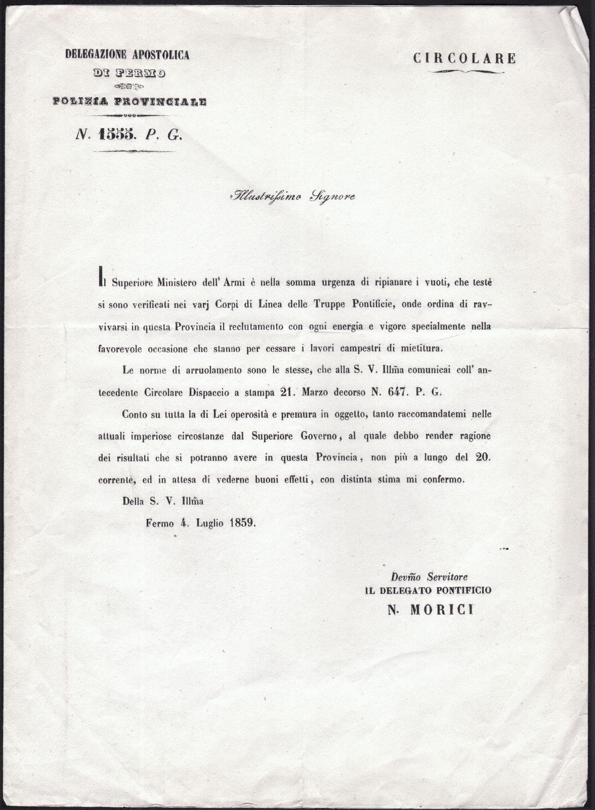 Delegazione Apostolica di Fermo Polizia Provinciale, per riempire i vuoti che si sono creati nei vari corpi di linea delle truppe pontificie Il delegato Pontificio Murici ordina in reclutamento, visto che stanno per cessare i lavori di mietitura. Fermo 4 luglio 1859. cm. 30 x 21,5
